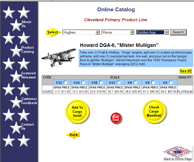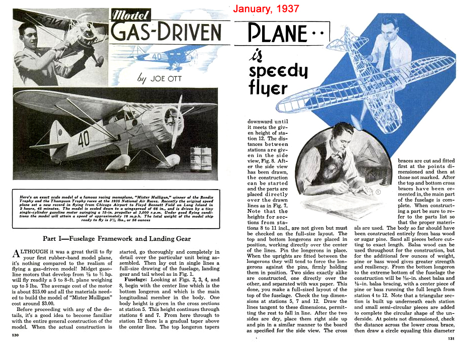 Cleveland Model of the Howard DGA-6 "Mr. Mulligan" Click to Enlarge You can buy the plans and patterns that will enable you to make this model right now. Click Here to go to the exact location on the Cleveland Website to get them. "Mr. Mulligan" at the Cleveland Site Click to Enlarge Cleveland was not the only source of information about Mr. Mulligan. In February of 1937, Popular Mechanics Published a two-part series on how to build a tetailed gas-powered scale model of this plane: Modeling "Mr. Mulligan" February, 1937 Click to Enlarge Joe Ott was widely recognized as an expoert designer of model airplanes. We have scanned the two part article and make it available as a free ".pdf" file.
