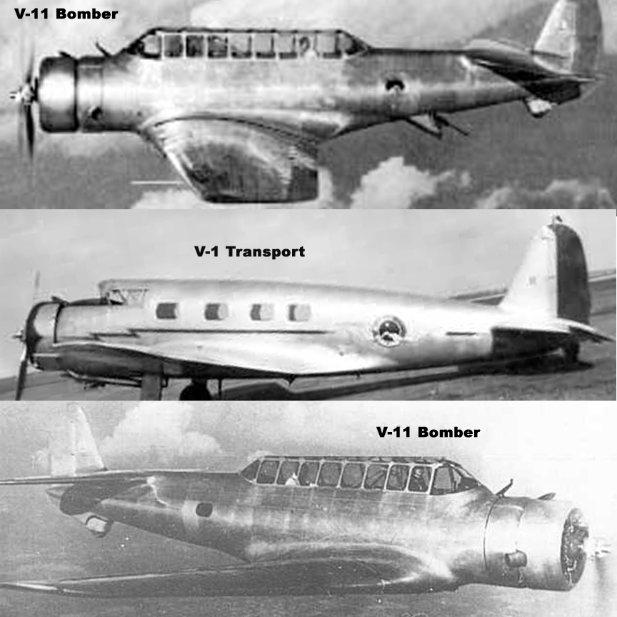 Vultee V-11 Light Bomber Click to Enlarge It was first flown in September 1935. It employed the same wing and undercarriage and essentially similar tail surfaces to the V-1A. The fuselage was new, a semi-monocoque stressed-skin structure of elliptical cross-section, incorporating an internal bomb-bay. A "greenhouse" canopy joined the two cockpits and could permit deployment of an aft-firing machine gun. It was owered by a Wright Cyclone radial engine driving a two-blade controllable-pitch metal propeller The wing centre section was built as an integral part of the fuselage and the stressed skin had corrugated reinforcements on the inside. The V-11G was a two-seater but the V-11GB was fitted with three seats for a crew consisting of pilot, bomb-aimer and rear gunner. A window for bomb-aiming was inserted in the floor below the gunner's swiveling seat and aft of this window there was a hatch which permitted the bomb-aimer to fire a gun aft and downwards. Observation windows for the bomb-aimer were inserted in the rear fuselage sides. Armament comprised four fixed forward-firing machine guns mounted in the wings and two aft-firing, one dorsal and one ventral gun on flexible mounts. The internal bomb-bay could hold about 150 lb of bombs and the alternative external load could comprise up to 225 lb. A few V-11s were acquired for service tests by the US Army as the A-19 and others were exported to Brazil (twenty-six), China (thirty) and Turkey (forty). A number of the V-12 derivative, which had a more powerful engine, was sold to China. Soviet representatives visited the Vultee plant in 1936 to discuss acquisition of the V-11GB. They obtained four as pattern aircraft and purchased a licence for series production in the Soviet Union. Although several examples were produced, the Soviet versions did not meet State performance standards. Click Here for more information about the Vultee V-11 Light Bomber. Click to go back and select another cover. | |||||||