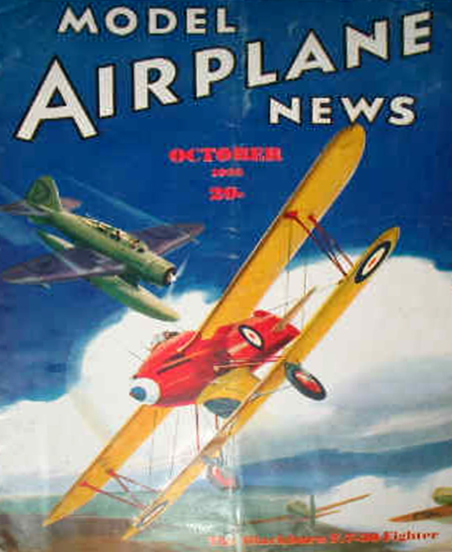 Model Airplane News October, 1936 Blackburn F7-30 Model Airplane News Cover Art for October, 1936 by Jo Kotula Click to Enlarge Built in 1934 as a night-fighter project, the F3 featured a stressed alloy frame, fabric wings and a steam cooled Rolls Royce Goshawk engine. The "stalk" below the cockpit housed the radiator. Prolonged taxiing trials cracked the fuselage and revealed a dangerously high center of gravity, the project was abandoned.