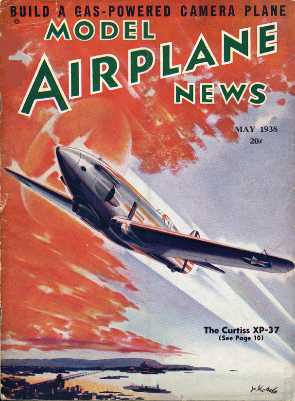 Model Airplane News May, 1938 Curtiss XP-37 Model Airplane News Cover Art for May, 1938 by Jo Kotula Click to Enlarge The new Allison turbocharged engine made a great impression on aircraft designers and buyers. It is no wonder that the Army, who was quite satisfied with the Curtiss P-36 fighter, oredered an experiment. One of the P-36 fighters was to be modified to use the new Allison powerplant. In response to this, Curtiss' chief designer Donovan Berlin fitted a 1150 hp Allison turbosupercharged engine to a p-36 airframe. He positioned the three Prestone cooling radiators immediately behind the engine. In order to balance the aircraft and to make room for the radiators, the pilot's cockpit was moved quite far aft. However, except for the cockpit relocation and the V-12 liquid-cooled engine, the XP-37 was otherwise identical to the P-36. The P-36