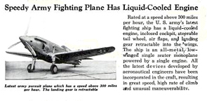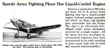 Curtiss XP-37 the way, waaa-y back cockpit Click to Enlarge The XP-37 in Popular Mechanics March, 1938 Click to Enlarge Almost from the first, the XP-37 aircraft ran into trouble. The supercharger was extremely unreliable, and the performance of the aircraft fell short of expectations. In addition, the positioning of the cockpit that far aft on the fuselage resulted in extremely poor visibility, especially during takeoffs and landings. The XP-37 was retired to an Army mechanics' school in August 1941 with a total of only 152 hours of flying time. In the meantime, the USAAC had already held a competition for a new fighter in January 1939, and had chosen another Berlin design, the Model 75P which was also derived from the P-36. This was eventually to emerge as the famous P-40. All further work on the XP-37 was abandoned. Click Here for more information about the Curtiss XP-37. Click to go back and select another cover. | |||||||