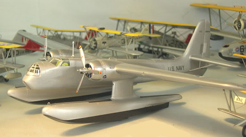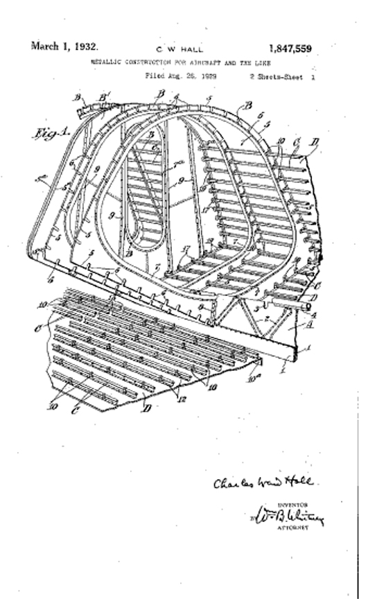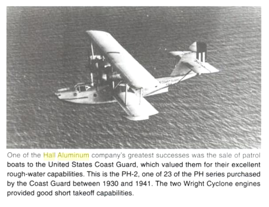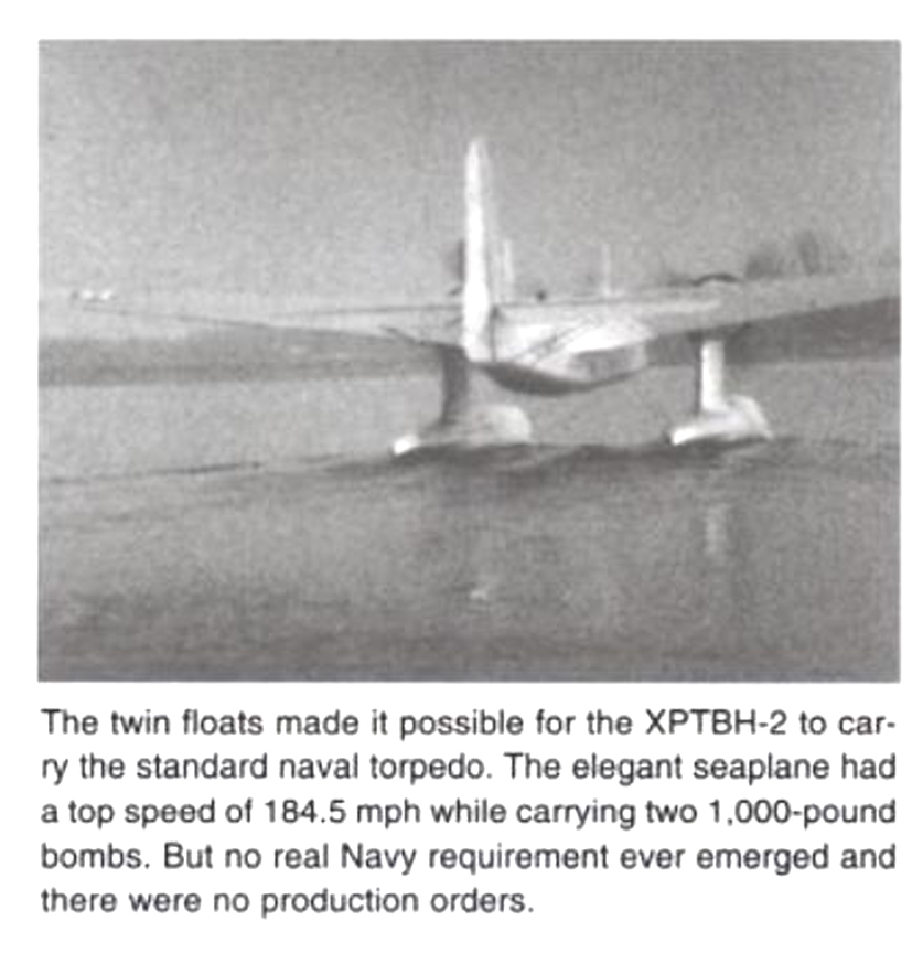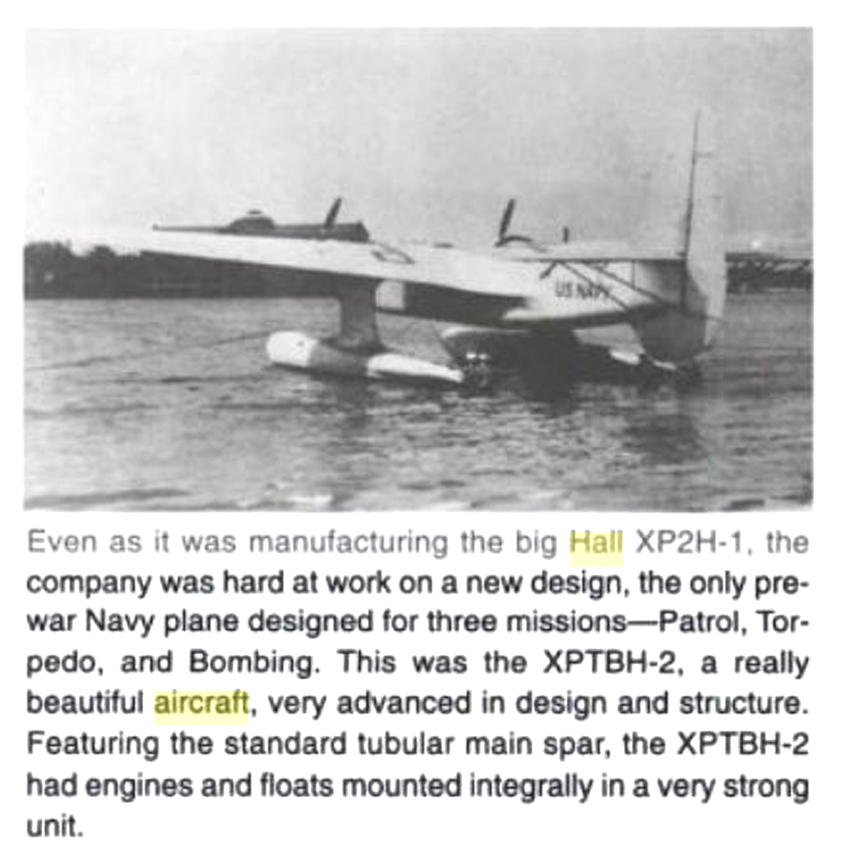 Photos of the Hall Aluminum Aircraft Co.XPTBH-2 Aluminum Construction Patent No. 1,847,559 Click to Enlarge The XPTBH-2 was the only prewar Navy plane designed for three missions: Patrol, Torpedo, and Bombing. Thge navy had specified hat the plane had to be capable of dropping the standard destroyer-type torpedo which was almost twice the size of aerial torpedoes then in use. The twin-float seaplane (with torpedo carried between the floats) was thought to be the best solution to this problem. A monoplane design was needed to attain the speed necessary for the bombing role; in order to achieve an aerodynamically clean aircraft, the wing wast to be cantilevered -- supported internally without external wires or braces. In order to thisfor an 80 foot wingspan required a 36 inch diameter aluminum tube as the main spar; it was paced at the center of pressure and carried both the flight and water loads. An ingenious truss system eliminated the need for cross-bracing the floats, so that the torpedo could be carried between them. The wing had an aluminum leading edge, but the rest was fabric covered.