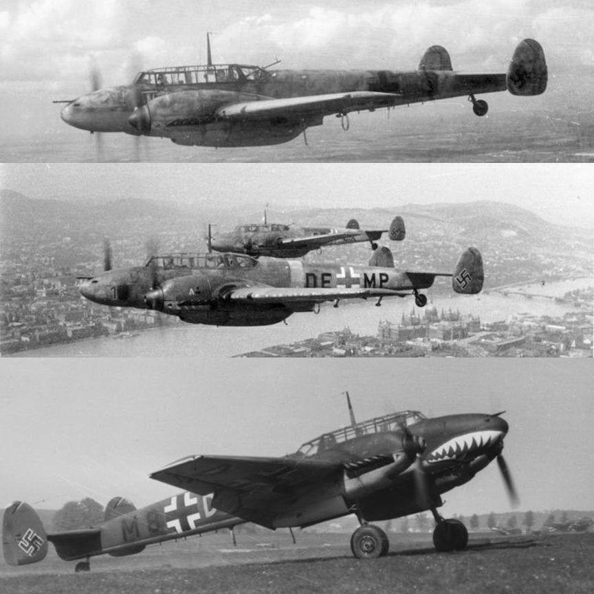Messerschmitt Bf110 "Eisenseiten" Click to Enlarge The Bf 110 served with success in the Polish, Norwegian and France campaigns. The Bf 110's lack of agility in the air was its primary weakness. This flaw was exposed during the Battle of Britain, where they experienced heavy losses. (The Bf 110 on the cover is about to be pounced upon by a P-38 Lightning). The Bf 110 was redeployed as night fighters, a role to which the aircraft was well suited. The Bf 110 enjoyed a successful period following the Battle of Britain as an air superiority fighter and strike aircraft in other theatres. During the Balkans Campaign, North African Campaign and the Eastern Front it rendered valuable ground support to the German Army as a potent fighter-bomber (Jagdbomber-Jabo). Later in the war, it became the major night-fighting aircraft of the Luftwaffe. Most of the German night fighter aces flew the Bf 110 at some point during their combat careers, and the top night fighter ace of all times, Major Heinz-Wolfgang Schnaufer, flew it exclusively, and claimed 121 victories in 164 combat missions. Of note, Bf 110 pilots were the first to paint shark teeth on the nose of the airplane, predating the Flying Tigers by several years. Here is a video of the Messerschmitt Bf110 "Eisenseiten" in action: Click Here for more information about the Messerschmitt Bf110 "Eisenseiten". Click to go back and select another cover. | |||||||