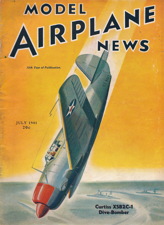 Curtiss XSB2C-1 "Helldiver" Model Airplane News Cover Art for July, 1941 and July, 1944 by Jo Kotula Click to Enlarge The experimental contract for the Helldiver was awarded by the US Navy on 15 May 1939 and the prototype XSB2C-1 first flew on 18 December 1940. From that date the Helldiver two-seat carrier-borne dive bomber was the subject of constant development. Armor, self-sealing tanks, protected fuel and oil lines, increased armament, a lengthened fuselage and a completely new tail unit with greatly enlarged fixed and moveable surfaces were incorporated in the production SB2C-1 which first flew in June 1942. From that date until November 1943 (when the Helldiver first went into action in the Pacific theatre of war) more than 880 design changes were made, some of which were part of the Army-Navy standardisation programme to permit the production of an Army version of the Helldiver as the A-25, which later served with the Marine Corps.