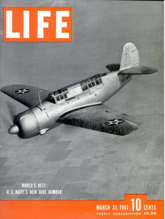 Curtiss SB2C "Helldiver" Made the cover of LIFE Magazine (March 31, 1941 issue) Click to Enlarge Armament consisted of four 12.7mm machine-guns in the wings and one on a hydraulic mounting in the rear cockpit. Armament changed to two 20mm cannon. The SB2C-4 and SB2C-5, more than 3,000 of which were built, were developments of the SB2C-3 with perforated wing flaps and under-wing bomb racks under the outer wings for eight 115mm rockets. Here is a video of a restored SB2C in action. The SB2C was on the cover of the May 31, 1941 issue of LIFE Magazine. Click here to download a ".pdf" of the article. Click Here for more information about the SB2C "Helldiver" . Click to go back and select another cover. | |||||||