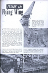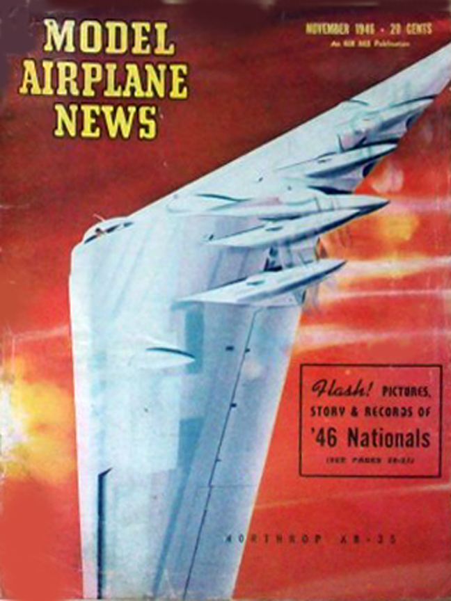 Model Airplane News November, 1946 Northrop XB-35 "Flying Wing" Model Airplane News Cover Art for November, 1946 by Jo Kotula Click to Enlarge Aviation pioneer John Northrop spent decades developing the concept of an all-wing aircraft, trading the weight and drag of a conventional fuselage and tail for greater speed and range. Such a design, not needing a conventional fuselage and tail assembly, would produce much less drag as it moved through the air. The air resistance thus saved could in turn be traded for significant advantages: higher speed, or the ability to carry a greater load at much greater ranges. With no need to confine most of the payload within a narrow and heavily-stressed fuselage, that weight can be evenly distributed across most of the lifting surface, resulting in a lighter and more efficient structure. Northrop devoted much of his career to proving that the all-wing concept could be used in a practical aircraft.