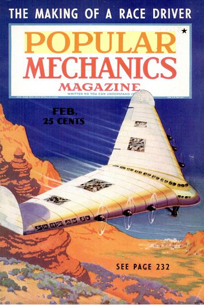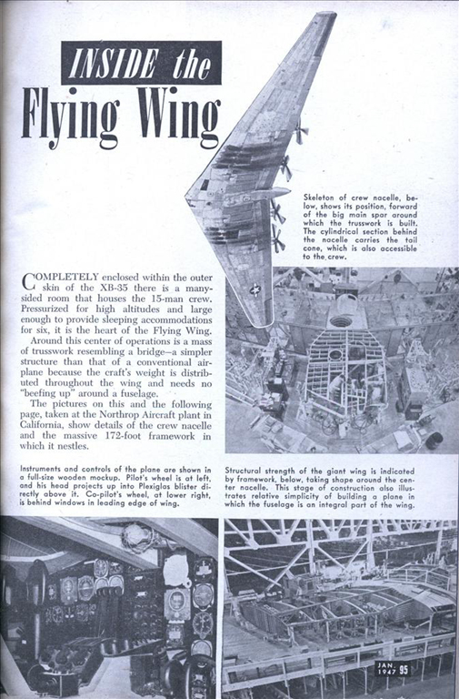 The Northrop XB-35 Flying Wing Click to Enlarge The Flying Wing was a romantic concept for science fiction writers as illustrated in this article in Popular Mechanics: The Flying Wing as a Concept From the February, 1938 issue Click here to read the entire article Click to Enlarge Aviation pioneer John Northrop spent decades developing the concept of an all-wing aircraft, trading the weight and drag of a conventional fuselage and tail for greater speed and the ability to carry a greater load at much greater ranges. With no need to confine most of the payload within the fuselage, the weight can be evenly distributed across most of the lifting surface, resulting in a lighter and more efficient structure. Popular Science Takes You Inside the Flying Wing From the January, 1947 issue Click here to read the entire article Click to Enlarge Northrop devoted much of his career to proving that the all-wing concept could be used in a practical aircraft.