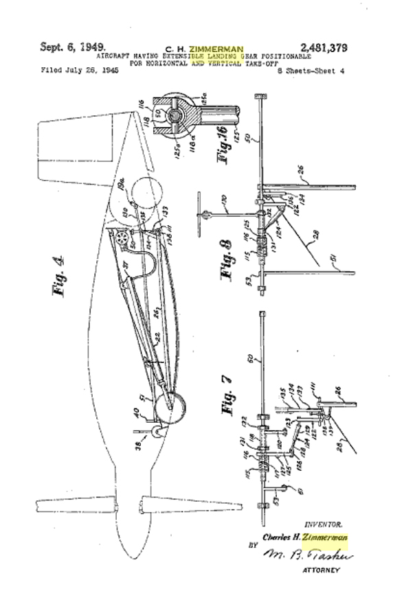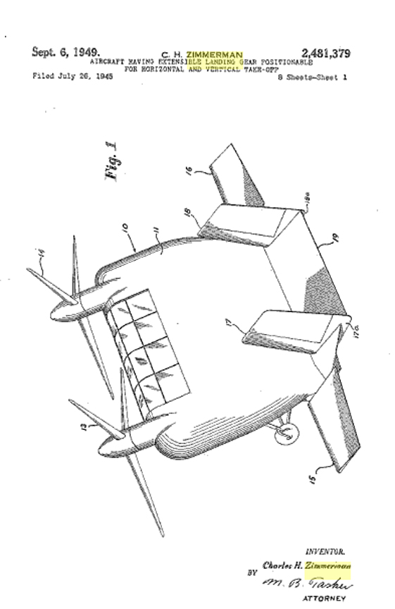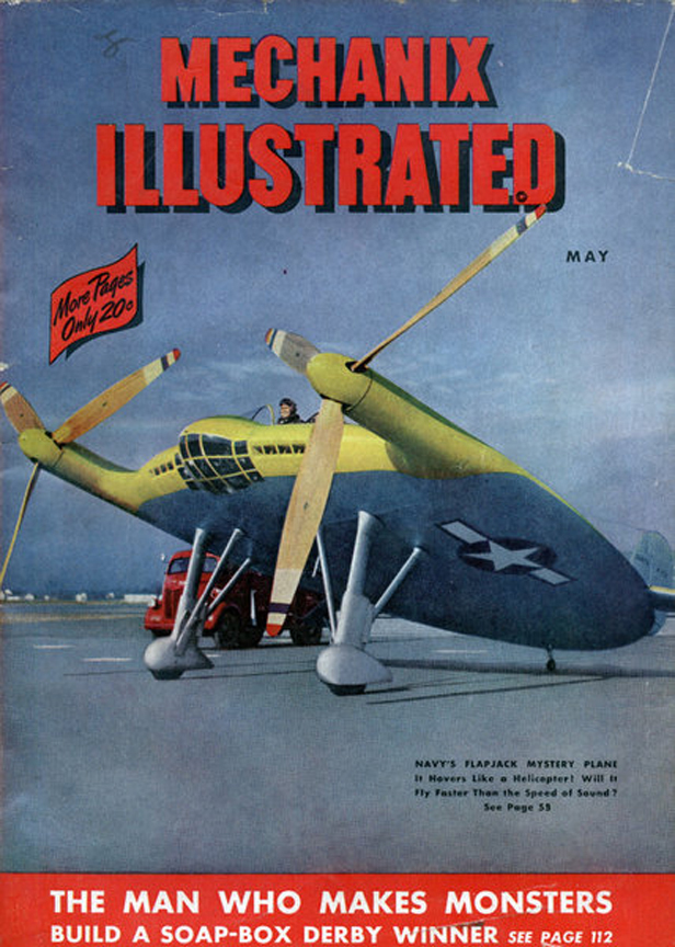 Vought XF5U "Flying Flapjack" and V-173 "Flying Pancake" Zimmerman Patent No. 2,481,379 Click to Enlarge In the 1930s, Charles Zimmerman, a noted aeronautical engineer, advocated the concept of "discoidal" aircraft, the so-called "Zimmer's Skimmers" and worked on a variety of projects on his own and with the Vought company. After testing using scale models, including a remotely controlled, electrically powered large scale model, designated the Vought V-162, the US Navy approached Zimmerman and offered to fund further development. Mechanix Illustrated Takes You Inside the Flying Flapjack From the May, 1947 issue Click here to read the entire article Click to Enlarge Data and concept documentation was given to the Navy in 1939, with wind tunnel tests on full scale models being completed in 1940-1941. The original prototype, designated the V-173 (Flying Pancake), was built of wood and canvas. It was designed as a "proof-of-concept" prototype, as shown in the patent diagrams. Here is a video of early experiments with the V-173: The XF5U-1 was a larger aircraft. Of all-metal construction, it was almost five times heavier than the V-173, with two 1,600 hp Pratt & Whitney R-2000 radial engines. The configuration was designed to create a low aspect ratio aircraft with low takeoff and landing speeds but high top speed. The XF5U design was promising with the ability to hover like a helicopter while having an airspeed range of 0 to 550 mph. However, it came at the time when the United States Navy was switching from propeller to jet propelled. By 1946, the XF5U-1 project was already long over its expected development time, and well over budget. The Navy canceled the project in early 1947, not long after it appeared on the cover of Model Airplane News. Here is a video of the Vought XF5U "Flying Flapjack": Click here for more information about the prototype V-173; Click Here for more information about the Vought XF5U "Flying Flapjack". Click to go back and select another cover. | |||||||