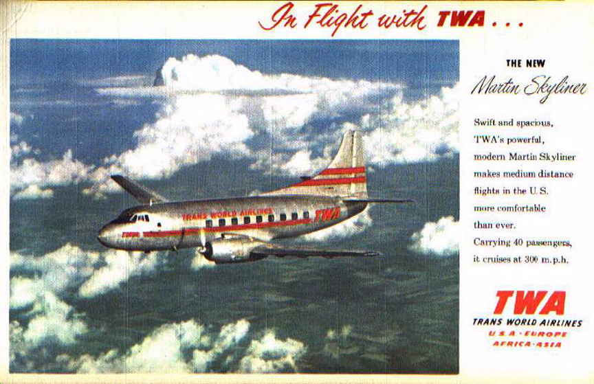 Martin 2-0-2 "Executive" Click to Enlarge On November 13, 1945 Pennsylvania Central Airlines purchased a fleet of 35 Martin 2-0-2's from the Glenn Martin Company, for a price of $7,000,000. Two weeks later, Colonial Airlines announced they would purchase 20 airplanes at the price of $4,000,000 and scheduled for delivery in 1947. Early in the next year, Martin announced Pennsylvania-Central Airlines ordered 15 more 202's bringing the total aircraft on order in early January 1947 to 137 aircraft, with a sales value of $27,000,000. Despite the announcement of these large orders, the contract terms allowed the airlines to cancel them without any penalty. The 2-0-2 was unpressurised, unlike the competing Convair 240. Therefore, as delays in production built up, all airlines except Northwest, TWA, LAN and LAV called their orders and only 31 2-0-2s and 12 2-0-2As were actually delivered to the airlines. The 2-0-2 was the first airplane subjected to the CAA's then new 'Accelerated Service Test', introduced May 15, 1947. In this test an airliner was to undergo a rigorous 150-hour test, attempting to squeeze one year's service into a week to ten day's flying. The 202 made such a test visiting about 50 cities in 7 days. At each city comprehensive inspections were made of the aircraft systems to assess how wear or malfunction would occur. Click Here for more information about the Martin 2-0-2 "Executive". Click to go back and select another cover. | |||||||