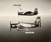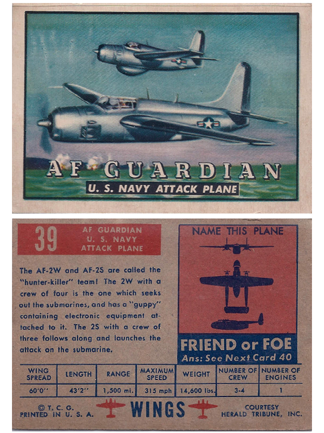 The Grumman Company called this Model"G-70"; when the Navy ordered three G-70 prototypes, the plane was designated "XTB3F". The initial XTB3F-1 prototype flew in December 1945. The turbojet intakes were masked off because of problems encountered in ground tests. The jet engine proved to be a bad idea and was quickly removed without ever being used in flight. The Navy decided that they no longer needed a new torpedo bomber, and told Grumman that they wanted an Anti-Submarine Warfare (ASW) aircraft instead. There was no way at the time to cram all the necessary ASW gear into a single aircraft, and so two variants of the "Guardian", as it was named, were planned, with the pair to act as a "hunter-killer" team. The single XTB3F-2 prototype became the "hunter" with two more seats for radar operators and a large ventral radome. This aircraft became the "XTB3F-1S" and first flew in November 1948. The second XTB3F-1 prototype was built as the "killer" member of the team, retaining the bombbay but deleting the cannon, adding a third seat, and providing a searchlight and short-range radar. This aircraft became the "XTB3F-2S" and first flew in January 1949, with both aircraft performing naval flight tests in February. The XTB3F-1S "hunter" was built as "AF-2W" (originally "AF-1S") Guardian, and the XTB3F-2S "killer" was built as the "AF-2S". The first production AF-2S Guardian flew on in November of 1949. The first operational aircraft went into service in October 1950. In addition to the cover of Model Airplane News, this airplane was also featured in the WINGS "Friend or Foe" trading card series of the early 1950s Trading card representation of the Grumman XTBF3-1 "Guardian". Click Here to see all 200 cards in the series Click to Enlarge Click Here for more information about the Grumman XTBF3-1 "Guardian". Click to go back and select another cover. | |||||||