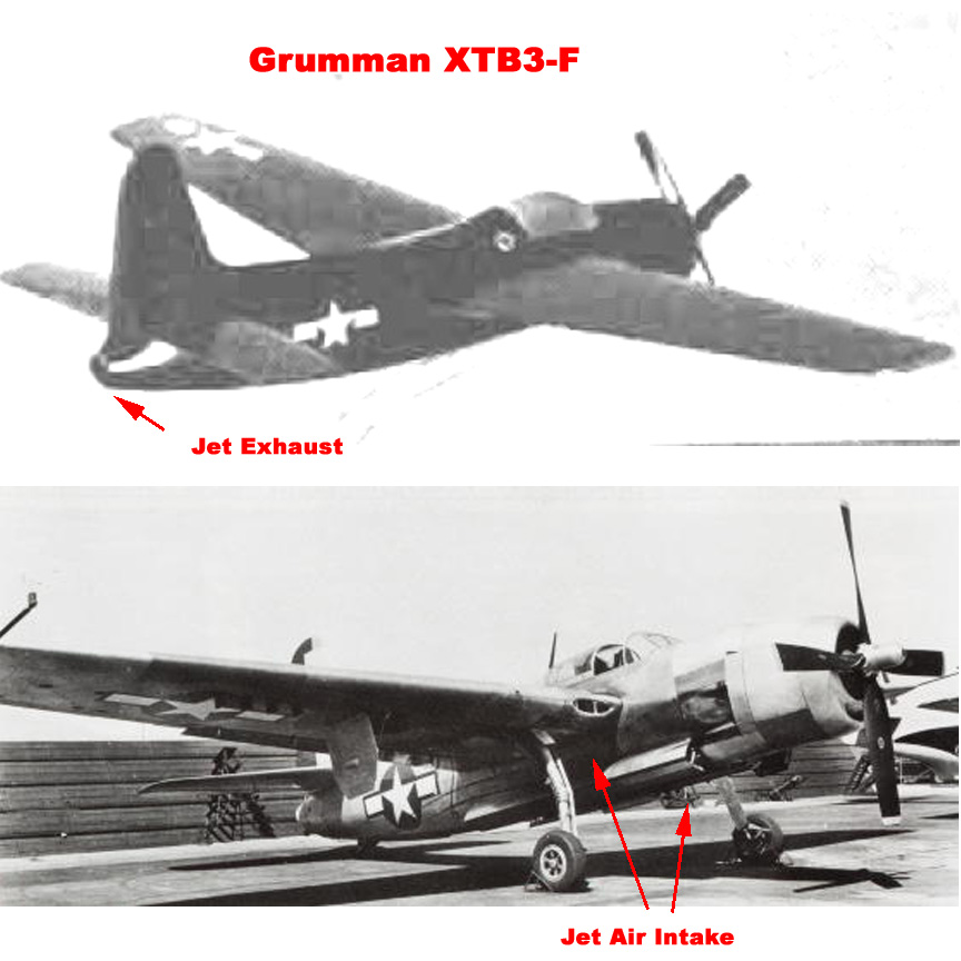 Grumman AF-15 "Guardian" Click to Enlarge Grumman then hit upon a solution using composite power, mixing piston engines with jet power. The aircraft would have two radial engines providing 2,300 horsepower and a turbojet in the tail. The turbojet was to be used to provide additional power for takeoffs and combat emergencies. It should be noted that at this time, composite power was somewhat in vogue. Jo Kotula was apparently quite enamored of the idea and featured most of the experimental composite power planes on the five covers of Model Airplane News,in addition to this one.