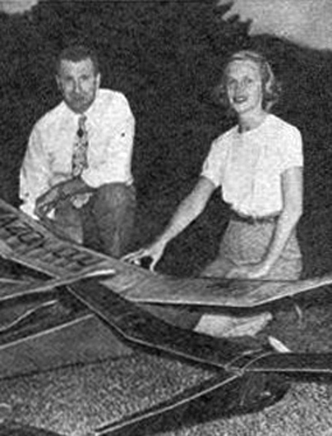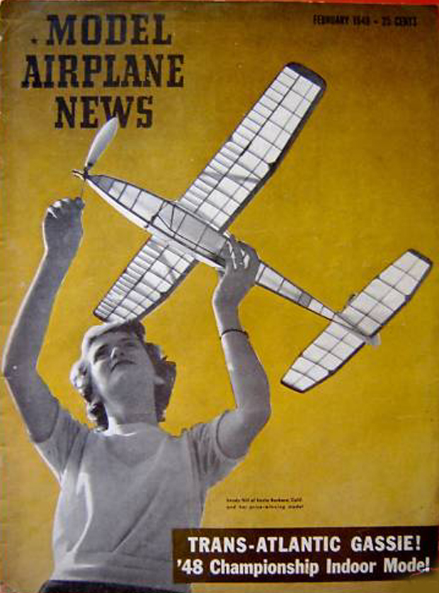 Model Airplane News February, 1949 Model Airplane News Cover for February, 1949 Girls and Model Airplanes Click to Enlarge The February, 1949 issue featured a photo of Sandy Hill of Santa Barbara California and her prize-winning Wakefield model. This is a Jasco Special. Sandy was the wife of Stan Hill, a long time modeler, free flight designer and Wakefield contestant; in 1949, they were both members of the Falcon Model Airplane Club and Stan was president. . The "Jasco Special" was sold by the Junior Aero Supply COmpany in 1947
