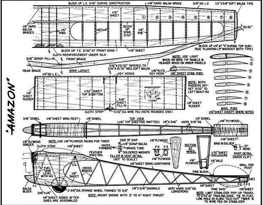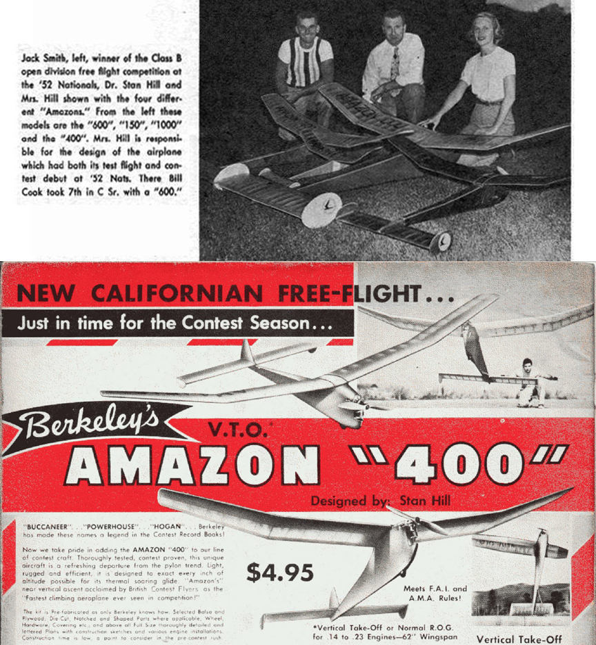 JASCO and the Hills Click to Enlarge Beginning in 1942, Stan Hill developed a series of high thrust line models under the theory that with the center of thrust, CG and center of drag nearly on the same line, the tight and, therefore, power wasting spiral climb of pylon ships would open up to a loose one-turn in five seconds and rate of climb would double. The original model was designed for FAI Competition in the 1950’s. Stan also constructed 1:1 homebuilts which he flew - all activity at his mountainside "factory" overlooking Santa Barbara. Stan died in 2008 Here are some photos the plans of "Amazon" the first in this line, circa 1942.