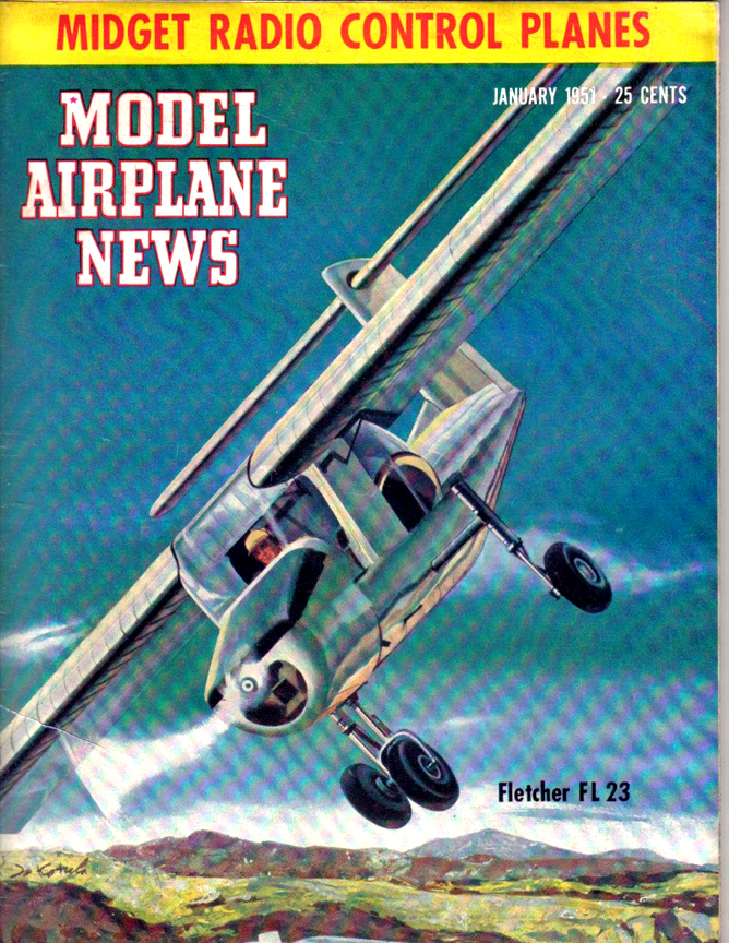 Model Airplane News January, 1951 Fletcher FL-23 Model Airplane News Cover Art for January, 1951 by Jo Kotula Click to Enlarge The Fletcher FL-23 was an American two-seat liaison or observation aircraft designed and built by the California-based Fletcher Aviation Corporation. The airplane was designed by John Thorp, whose Sky Skooter was featured on the August, 1947 issue of M.A.N. It was entered into a competition and lost against the Cessna 305A as a liaison or observation aircraft for the United States Army The FL-23 prototype was designed and built as a private venture, it was a high-wing cantilever monoplane with an all-moving tailplane mounted at the top of the fin. It had a fixed tricycle landing gear and powered a 225-hp (168 kW) Continental E225 piston engine. It had room for a pilot and observer in tandem; the observer had an unusual acrylic plastic enclosure to give an all-round visibility. Fletcher FL-23