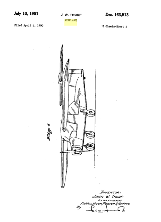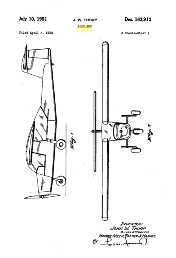 Thorp/Fletcher Design and the Winner Design Patent D-163,913 Click to Enlarge The US Army issued the specification for a two-seat liaison and observation monoplane and the prototype was entered into the competition. During trials the aircraft was badly damaged in a flying accident when it lost its tail, and was withdrawn from the competition. The competition was won by the Cessna 305A which became the L-19 (O-1) Bird Dog. Click Here for more information about the Fletcher FL-23. Click to go back and select another cover. | |||||||