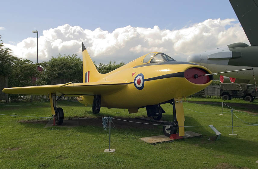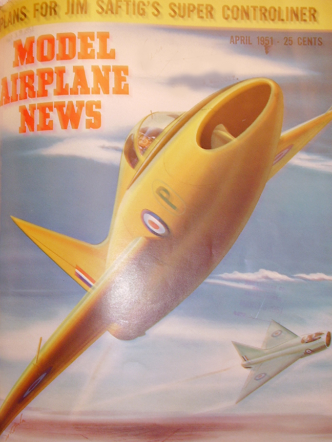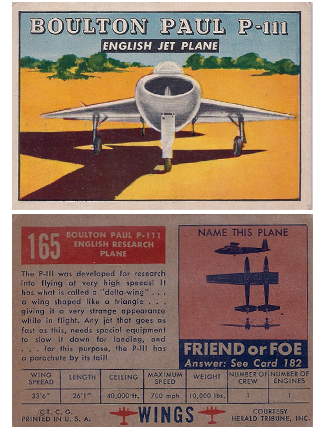 Boulton-Paul P.111 "Delta" Click to Enlarge In the late 1940s and early 1950s the allied aircraft industries were engaged in many projects to confirm and develop the design ideas captured from the Germans at the end of the Second World War. As part of this activity the P.111 was built for the Air Ministry to specification E.27/46 by Boulton Paul Aircraft Ltd to investigate the possibilities of the delta planform wing. The P.111 was designed as the smallest airframe which could couple a jet engine, an ejection seat, and a delta wing. The P.111 made its first flight in October of 1950. It was used by the RAE in a series of explorations of delta wing characteristics and later based at RAE Bedford. During this time it flew with each of the three alternate wing tips. After a last flight in 1958 it went to the Cranfield College of Aeronautics as a training airframe. In 1985 it was transferred to the Midland Air Museum, Warwickshire, England, where it is on static public display. Here is a video of the Boulton-Paul P.111 "Delta" in action: In addition to the cover of Model Airplane News, this airplane was also featured in the WINGS "Friend or Foe" trading card series of the early 1950s Trading card representation of the Boulton-Paul P.111 "Delta" Click Here to see all 200 cards in the series Click to Enlarge Click Here for more information about the Boulton-Paul P.111 "Delta". Click to go back and select another cover. | |||||||