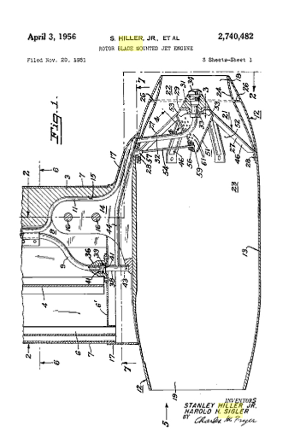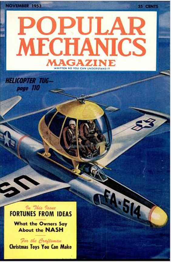 The F-89 "Scorpion" and the Helicopter Tug Reaction Jet Patent No. 2,740,482 Mini Helicopter Patent No. 2,481,745 Click here to read a ".pdf" of the article about the Helicopter Tug Click to Enlarge This scheme was fraught with some risk, since jet planes tend to drop like a stone unless they are moving at well over the maximum speed of the little helicopter. Landing posed other problems. However, the fellow who cme up with the idea was Sidney Hiller, certainly no flake. He perfected the reaction-jet helicopter and made significant contribution to the modern use of the helicopter by the military. He sold a number of his ultra-small "Hornet" helicopters. Click Here for more information about the F-89 Scorpion. Click to go back and select another cover. | |||||||