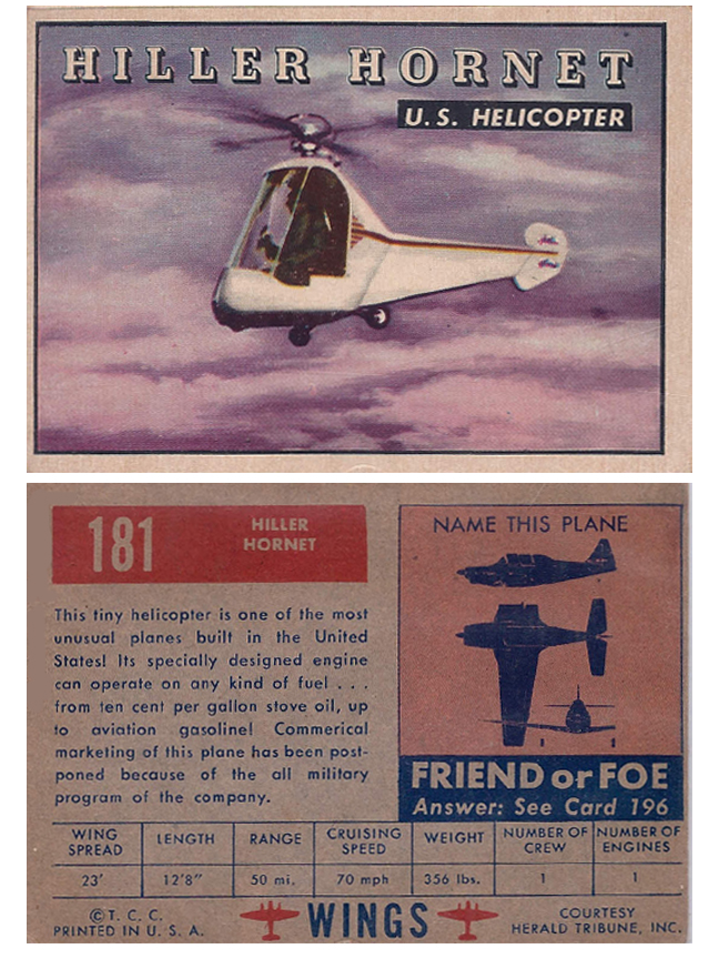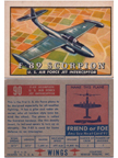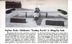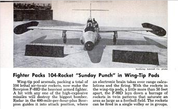 Rocket Pods for the F-89 "Scorpion" Click to Enlarge Here is a video with some early footage of the F-89: In addition to the cover of Model Airplane News, this airplane was also featured in the WINGS "Friend or Foe" trading card series of the early 1950s Trading card representation of the Northrop F-89 "Scorpion" Click Here to see all 200 cards in the series Click to Enlarge The Scorpion was in the news as well, appearing in a supporting role on the cover of the November, 1953 issue of Popular Mechanics. The article describes how a "Helicopter Tug" would lift the F-89 off a more-or-less conventional ship and then release it, obviating the need for an aircraft carrier.