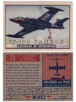 " > Photos of the AVRO CF-100 "Canuck" Click to Enlarge In the early 1950s, Canada needed an interceptor (fighter) able to patrol the vast areas of Canada's north and operate in all weather conditions. The two-seat fighter crewed by a pilot and navigator, was designed with two powerful engines and an advanced radar and fire control system housed in its nose that enabled it to fly in all-weather or night conditions. For its day, the CF-100 featured a short takeoff run and high climb rate, making it well suited to its role as an interceptor. The CF-100 was not considered to be truly supersonic since it could not exceed the speed of sound in level flight. However, on 18 December 1952, S/L Janusz Zurakowski, the Avro company chief development test pilot, broke the sound barrier flying the CF-100 Mk 4 prototype in a dive from 30,000 feet. Here is a video of the AVRO CF-100 "Canuck" in action: In addition to the cover of Model Airplane News, this airplane was also featured in the WINGS "Friend or Foe" trading card series of the early 1950s Trading card representation of the AVRO CF-100 "Canuck" Click Here to see all 200 cards in the series Click to Enlarge Jo Kotula revisited this airplane in the "Box Art" for the Aurora kit for the AVRO CF-100 "Canuck". Aurora Plastic Model of the AVRO CF-100 "Canuck" Artwork by Jo Kotula Click to Enlarge Click Here for more information about the AVRO CF-100 "Canuck". Click to go back and select another cover. | |||||||