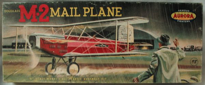 Photos of the Douglas M-2 Mailplane Click to Enlarge The United States Post Office began air mail service in 1918 mainly using variants of World War I biplanes. In 1925, it placed an order with Douglas for a replacement aircraft based on the Douglas O-2 observation biplane. The company modified an O-2 by covering over the forward cockpit to make a mail compartment and moving the pilot into what had been the Observers cockpit. This version was designated M-1. When the Contract Air Mail (CAM) routes were introduced the newly formed Western Air Express Company (later Western Airlines) ordered six mailplanes with the designation M-2. (This is the version shown on the cover) It also had the provision to carry a passengerinstead of mail in the front cockpit. Just before Western Air Express introduced the aircraft into service (in April 1926 from Los Angeles to Salt Lake City) the Post Office ordered 50 aircraft designated M-3 for its major route network. The M-3 had only minor differences from the M-2. Douglas then re-designed the M-3 to try and increase or double the payload and the new aircraft was deisgnated the M-4. The M-4 had a new longer span wing and the Post Office converted some of the M-3 order to be built as M-4s. One M-4 was also bought by Western Air Express and this was designated the M-4A. With the introduction of three-engined aircraft types from 1928 the Douglas mailplanes were withdrawn from service, some were sold but most were scrapped. Jo Kotula revisited this airplane in the "Box Art" for the Aurora kit for the Douglas M-2 Mailplane. Aurora Plastic Model of the Douglas M-2 Mailplane Artwork by Jo Kotula Click to Enlarge Click Here for more information about the Douglas M-2 Mailplane. Click to go back and select another cover. | |||||||