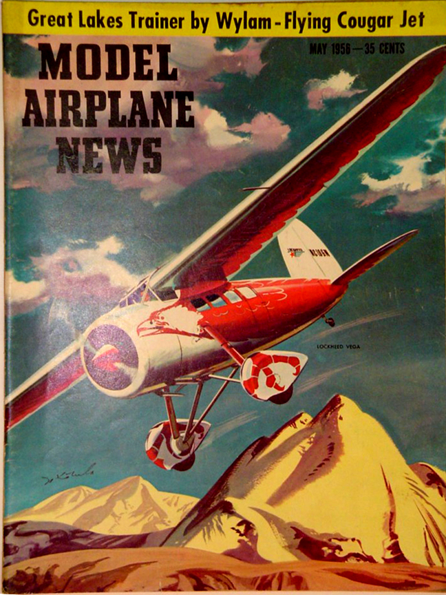 Model Airplane News May, 1956 Lockheed "Vega" Model Airplane News Cover Art for May, 1956 by Jo Kotula Click to Enlarge The Vega was a six-passenger monoplane built by the Lockheed company starting in 1927. It became famous for its use by a number of record breaking pilots who were attracted to the rugged and very long-ranged design. Amelia Earhart became the first woman to fly the Atlantic single handed in one, and Wiley Post flew his around the world twice.