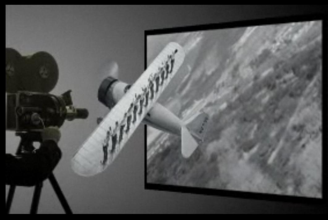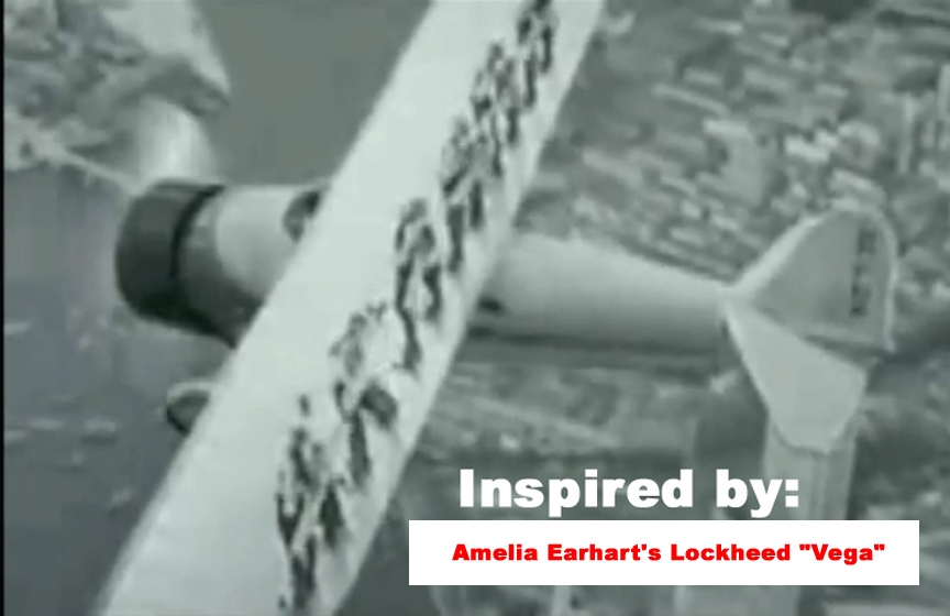 We believe that one of the plane in the film is the Lockheed Vega. In the film, it is only shown from one view, leading us to believe that it was a model. We have studied the dancers on the wing and feel that they are an actual chorus line (not little clay figures as the photo on the left would suggest). This shot was probably done with a double traveling mat in which the model was superimposed on the background and then the dancers were superimposed on the wing. Although the Vega was a very good airplane, we do not believe it was capable of lifting twelve dancers on the wing.