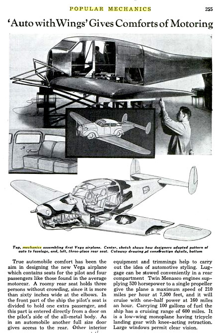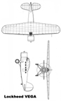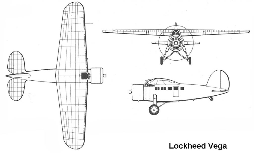 Lockheed "Vega" Click to Enlarge Designed by John Knudsen Northrop and Gerrard Vultee, both of whom would later form their own companies, the plane was originally intended to serve with Lockheed's own airline routes. They set out to build a four-seat aircraft that was not only rugged, but the fastest aircraft as well. Utilizing the latest designs in monocoque fuselages, cantilever wings and the best engine available, the Vega delivered on the promise of speed. The fuselage was monocoque, built from sheets of plywood, skinned over wooden ribs. Using a large concrete mold, a single half of the fuselage shell was laminated in sections with glue and then a rubber bladder was lowered into the mold and inflated with air to compress the lamination into shape. Two fuselage halves were then nailed and glued over a previously made rib framework. With the fuselage constructed in this fashion, the wing spar had to be kept clear, so they decided to make a single spar cantilever mounted on the very top of the aircraft. The only part of the aircraft that wasn't particularly streamlined was the landing gear although production versions wore sleek "spats". The first Vega 1, named the Golden Eagle, flew from Lockheed's Los Angeles plant on July 4, 1927. It could cruise at a then-fast 120 mph, and had a top speed of 135 mph. However. the four-passenger (plus one pilot) load was considered too small for airline use. A number of private owners placed orders for the design however, and by the end of 1928, they had produced 68 of this original design. In the 1928 National Air Races in Cleveland, Vegas won every speed award. Looking to improve the design, Lockheed delivered the Vega 5 in 1929. Adding 450 hp engine allowed two more seats to be added. A However, even the new six-seat configuration proved to be too small, and the 5 was purchased primarily for private aviation and executive transport. A total of 64 Vega 5s were built. In 1931, the US Air Corps bought two Vega 5s Lockheed "Vega", Mark 2 ...in Popular Mechanics August, 1938 Click to Enlarge As indicated in the Popular Mechanics article above, in the mid 1930s, Lockheed had redesigned the Vega to make an airplane that was as comfortable as an automobile. This twin-tailed low-wing monoplane became the design basis for the . Here is a video of the Lockheed "Vega": The Vega (or a model thereof) is one of the stars of the 1933 film Flying Down to Rio which is noteworthy for two things: