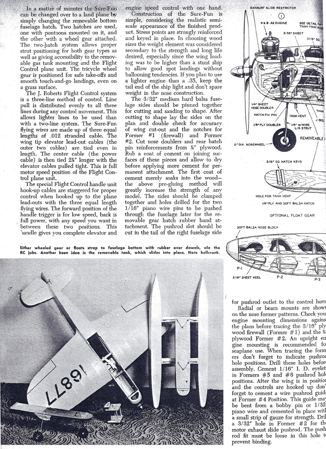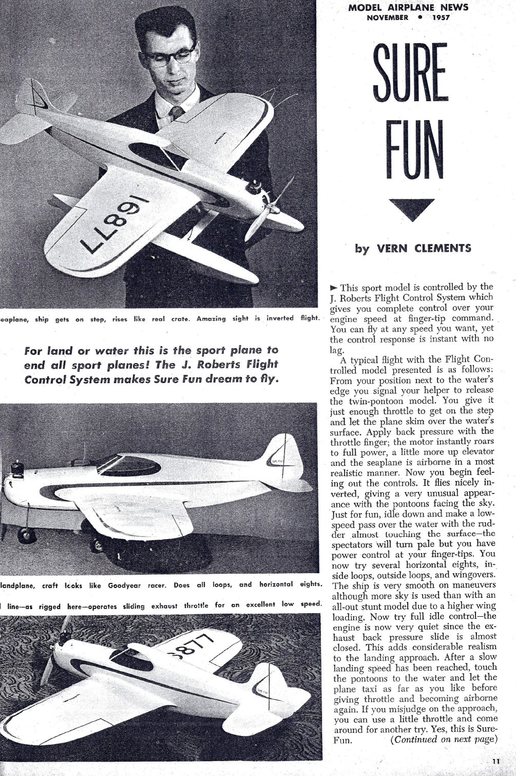 Model Airplane News November, 1957 Model Airplane News Cover for November, 1957 Vern Clements and Sure Fun Click to Enlarge The November, 1957 issue presented Vern Clements and his control-line floatplane "Sure Fun" that can be converted to a landplane. Of some note, this plane was among the first to use the "J.Roberts Flight Control System". There are a number of different types of proper speed control system that can be used to operate a remote control throttle for the engine engine:
