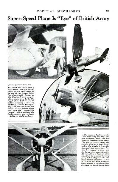 Westland "Lysander" Click to Enlarge The 1934 Westland design, internally designated P.8, was the work of Arthur Davenport under the direction of W.E.W. (Teddy) Petter. It was Petter's second aircraft design and he spent considerable time interviewing Royal Air Force pilots to find out what they wanted from such an aircraft. The result of Petter's enquiries suggested that field of view, low-speed handling characteristics and STOL performance were the most important requirements. Davenport and Petter worked to design an aircraft around these features: the result was unconventional It had high wings and a fixed conventional landing gear faired inside large, streamlined spats. The spats had mountings for small, removable stub wings that could be used to carry light bombs or supply canisters. In appearance it was not dissimilar to the Polish LWS-3 Mewa. The wings had an unusual reverse taper towards the root, which gave the impression of a gull wing, although in fact the spars were perfectly straight. It had a girder type construction with an light wood frame around that to give the aerodynamic shape. The forward part was duralinum tube joined with brackets and plates, the after portion stainless steel tubes welded. Plates and brackets were cut from channel extrusions rather than forming from sheet steel. The front spar and lift struts were extrusions. The wing itself was fabric covered. The "Lysander" in Popular Mechanics February, 1937 Click to Enlarge The first Lysanders entered service in June 1938, were initially used for message-dropping and artillery spotting. When war broke out in Europe, the earlier models operated with the Chindits of the British Indian Army in the Burma Campaign. Four regular squadrons equipped with Lysanders accompanied the British Expeditionary Force to France. These were put into action as spotters and light bombers. In spite of occasional victories against German aircraft, they made very easy targets for the Luftwaffe unless escorted by Hurricanes. Almost half the Lysanders operating in and over France were lost and, with the fall of France, the type was quickly withdrawn from its army co-operation role. Back in England, some went to work operating air-sea rescue dropping dinghies to downed RAF aircrew in the English Channel. In August 1941, a new squadron, No. 138 (Special Duties), was formed to undertake missions for the Special Operations Executive to maintain clandestine contact with the French Resistance. Among its aircraft were Lysander Mk IIIs, which would fly over and land in occupied France. While general supply drops could be left to the rest of No. 138's aircraft, the Lysander could insert and remove agents from the continent or retrieve Allied aircrew who had been shot down over occupied territory and had evaded capture. For this role, the Mk IIIs were fitted with a fixed entry/exit ladder over the port side to hasten access to the rear cockpit and a large drop tank under the belly. In order to slip in unobtrusively, the Lysanders were painted matte black; operations almost always took place within a week of a full moon, as moonlight was essential for navigation. The Lysanders flew from secret airfields at Newmarket and later Tempsford, but used regular RAF stations to fuel-up for the actual crossing. Flying without any navigation equipment other than a map and compass, Lysanders would land on short strips of land, such as fields, marked out by four or five torches. They were only designed to carry one passenger in the rear cockpit, but in case of urgent necessity, three could be carried in extreme discomfort. The pilots of No. 138 and, from early 1942, No. 161 Squadron transported 101 agents to, and recovered 128 agents from Nazi occupied Europe. The Lysander proved to be a success in this role and continued to undertake such duties until the liberation of France in 1944. Here is a video of the Westland "Lysander": Click Here for more information about the Westland "Lysander". Click to go back and select another cover. | |||||||