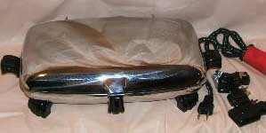 ![]() "Lightning" Heat lamp From the Remnants of Edison of Canada ![]() ![]() "Everhot" Toaster From the Remnants of the Swartzbaugh Manufacturing Company, Toledo ![]() The Fostoria Vacuum Coffee Brewer New With the Original Box You might want to check out our page on Vacuum Coffee Brewers to contrast the last item with some quality pieces -- the cheesy wood handle is a dead giveaway! Here is a waffle iron based on the classic Manning-Bowman design with an inset thermometer. Notice that the Bakelite handles are very thin. Contrast this with our photoessay on the magnificent Manning-Bowman Twin-o-Matic. ![]() The Bersted Waffle Iron A Pale Imitation of the Manning-Bowman Waffle Iron Here is a gadget that could be used for popping corn or roasting coffee beans. This may be from the 1926 Chicago incarnation of the Bersted Company. The resistance heat is supplied in the chrome base. A metal bowl with a hinged glass lid fits into the base. A knob at the top allows the user to spin a metal agitator inside the heated bowl to mix whatever was inside. This is only about 8 inches on a side and one could not pop a whole lot of corn in it; my guess is that it was primarily intended to roast coffee or nuts. ![]() The Bersted Coffee Roaster Probably from the Chicago Factory Here is another knock-off, drug store type appliance found in an attic (new and untouched) by our friend Jim -- it is supposed to be a shoe polisher, although it owes much of its heritage to Mr. Bersted's fan/mixer/vibrator... The Valiant Shoe Polisher From the Morris-Struhl Company, new in the box... The moral of this: If you shop at Wal-Mart, your purchases aren't likely to be treated well by historians! | |||||||