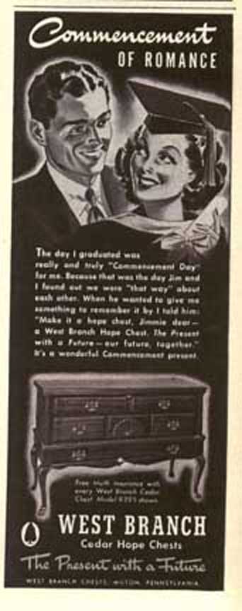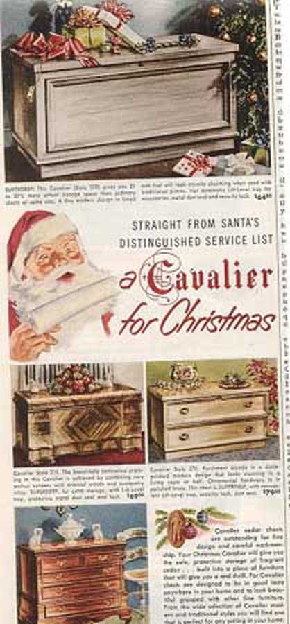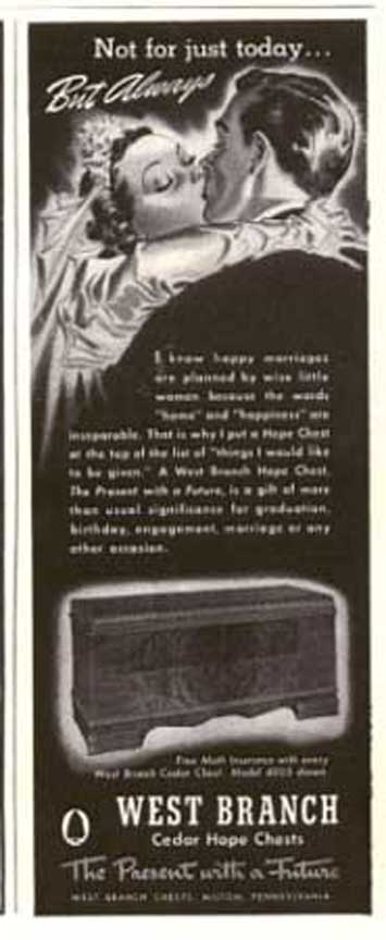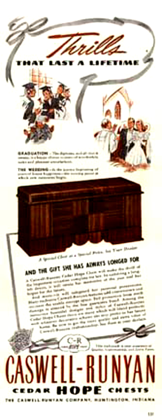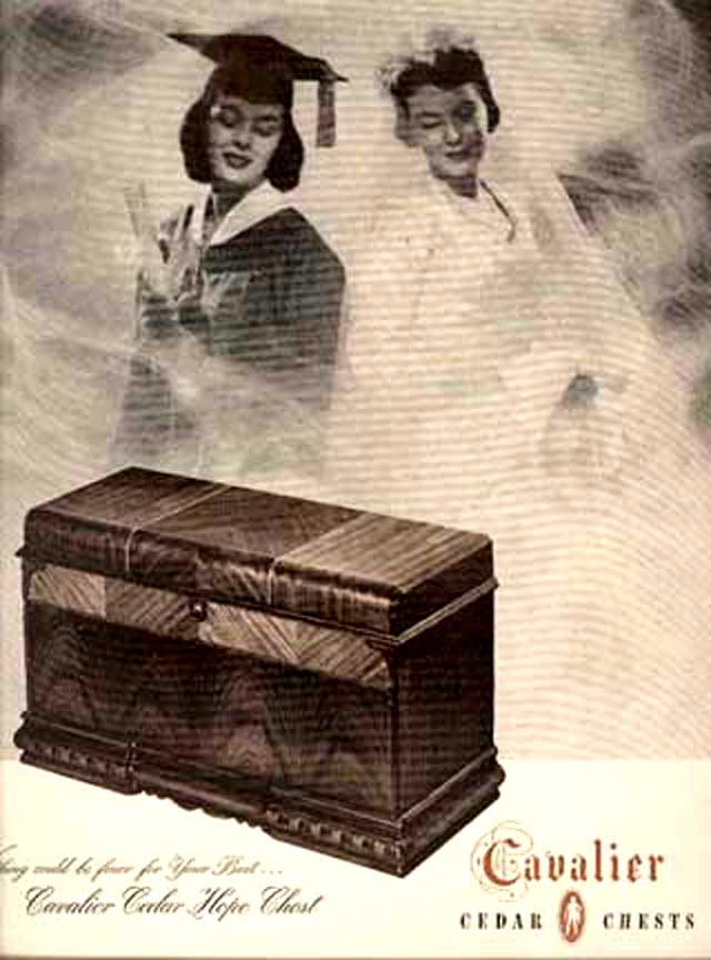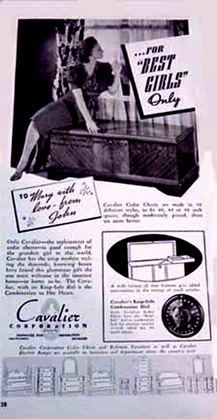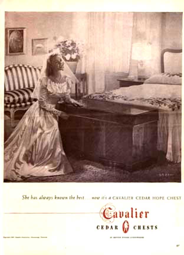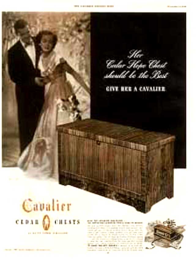 National Association of Cedar Chest Manufacturers Left: Kathy's Traditional Cedar Chest Middle: National Association Woodburned Mark right: Excerpt from the New York Lumber Trade Journal,1923 Click to Enlarge Basically, the chest provides a place to store fabric articles so that moths won't get at them. However, the marriage-related themes on the paper labels indicate that most of these were used as a "Hope Chest." Typically, this would be a gift from parents to a young lady on or about her 14th birthday (or so). The young lady then began a quaint ritual of assembling items for her dream home and storing them in this chest. This would include works of knitting, embroidery and/or crochet, to be augmented by occasional silver place settings given on birthdays and holidays. When young ladies of the period gathered, items from the hope chest would be retrieved one-by-one and set the stage for grave and serious discussion of the idyllic home life to come. These dreams were embodied in the following advertisement placed in LIFE Magazine. Ad For Cavalier Hope Chests LIFE Magazine, November 24, 1947 p. 87 Cavalier Ads are not very common-- the Chests Sold by Word of Mouth Click to Enlarge I do not believe that young ladies do much of this any more. This practice created an unusual situation for historians and other people who must reconstruct every day life in the past -- most "typical" homes contained objects that reflected an eclectic taste over the 4-10 year period that young women may have been assembling their "Hope Chest." Thus, you will not find a pictures of a home, say in 1947, with every item from that year. Period films often fail to recognize the fact of the 10 year collection of artifacts, and often appear as if the homeowner went out and bought everything in the house the day before the scene was shot. If you want a retro lifestyle, you have to take this into account. Also, appliances like toasters, coffee makers and radios were very expensive relative to people's income. Hence, they hung onto them for a long time, even after they went out of fashion. In fact, the expense of the cedar chest is the reason that so many of them are around today! There were lots of other people manufacturing "Hope Chests" -- here are some of their ads. Note that they, too rely on Graduation, Weddings, and major holidays as a theme. During peacetime (June 1941 and 1951) they espouse rosy hopes for the future.