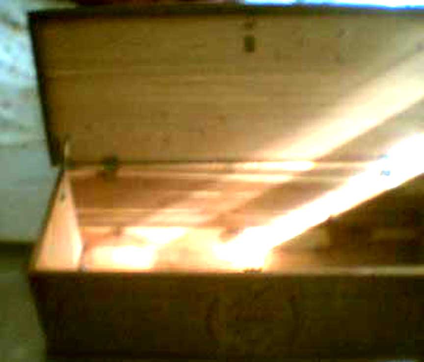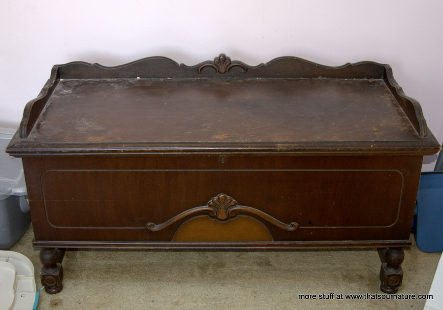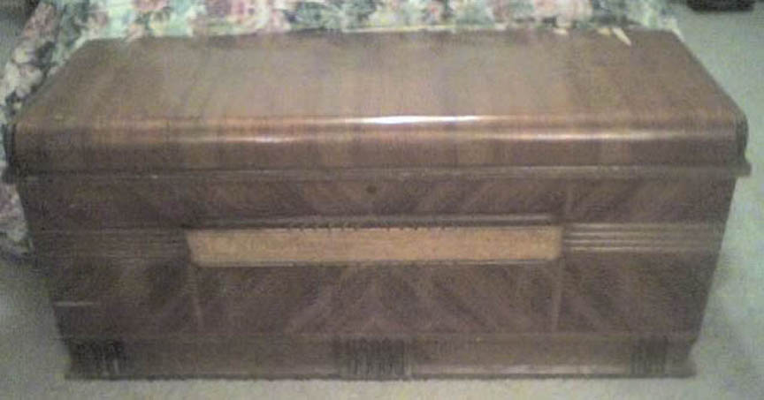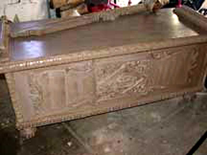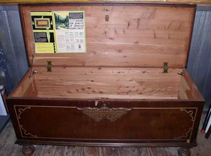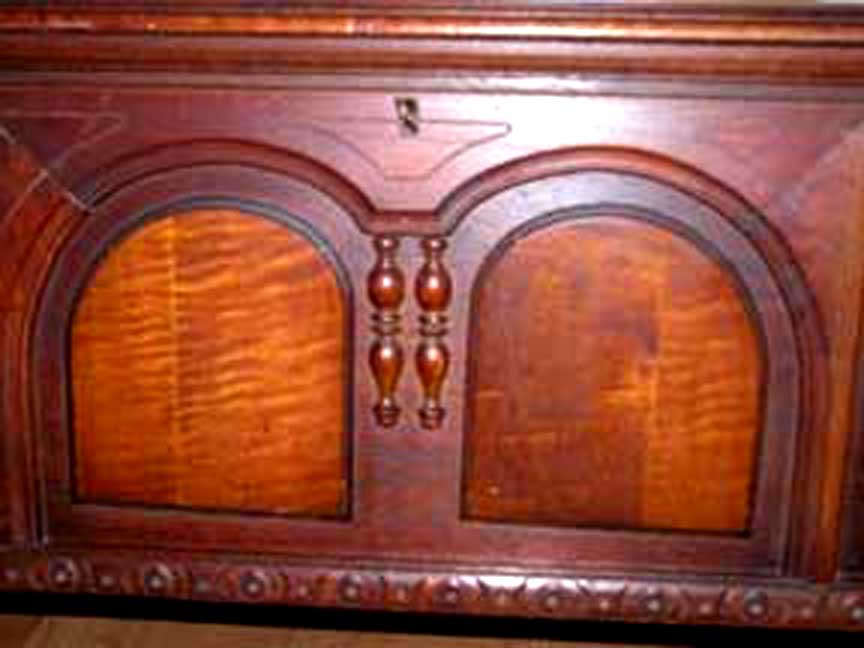 Traditional (non-Modern) Cavalier Cedar Chests left: Aunt Evey's Cavalier Chest in the Jacobean style right: Frank's Queen Anne Style Cavalier Chest Click to Enlarge Our reader Arthur sent us this picture of his Aunt Evey's Hope Chest which she got for her 16th birthday; it is also in the Jacobean style. Our reader Frank sent us this picture of a VERY well-preserved Cavalier Chest in the Queen Anne style. The characteristic "Cabriolet Legs" (they look like they have knees..) and the Shell motif in the center are the hallmarks of this style. You can buy a Cavalier chest in excellent condition for somewhere in the neighborhood of $500 (depending on style). Vastly inferior new cedar chests cost even more. If you choose to have your chest restored by a professional, any expenditure over $500 is most likely based on sentiment, not investment value. Get an old wool sock. Cut off the toe about halfway. Then cut the rest into little strips; get a piece of clean muslin and wrap the strips very tightly in it, until you have a thing about the size of a golf ball. Soak this in alcohol and then add just a bit of shellac. Put the "ball" inside the "toe" of the sock and whack it on a board until the "toe" part is wet. Rub this in a figure-8 motion --- very quickly --- across the surface. The alcohol will dissolve the shellac and the slightly abraisive wool will "reamalgamate" the finish. This is called "French Polishing" --- although classic use of the term involves a whole lot more steps.