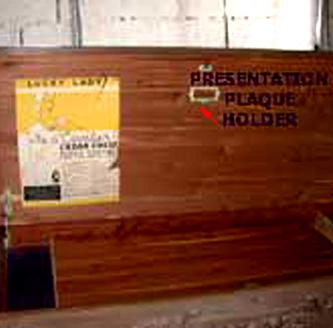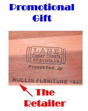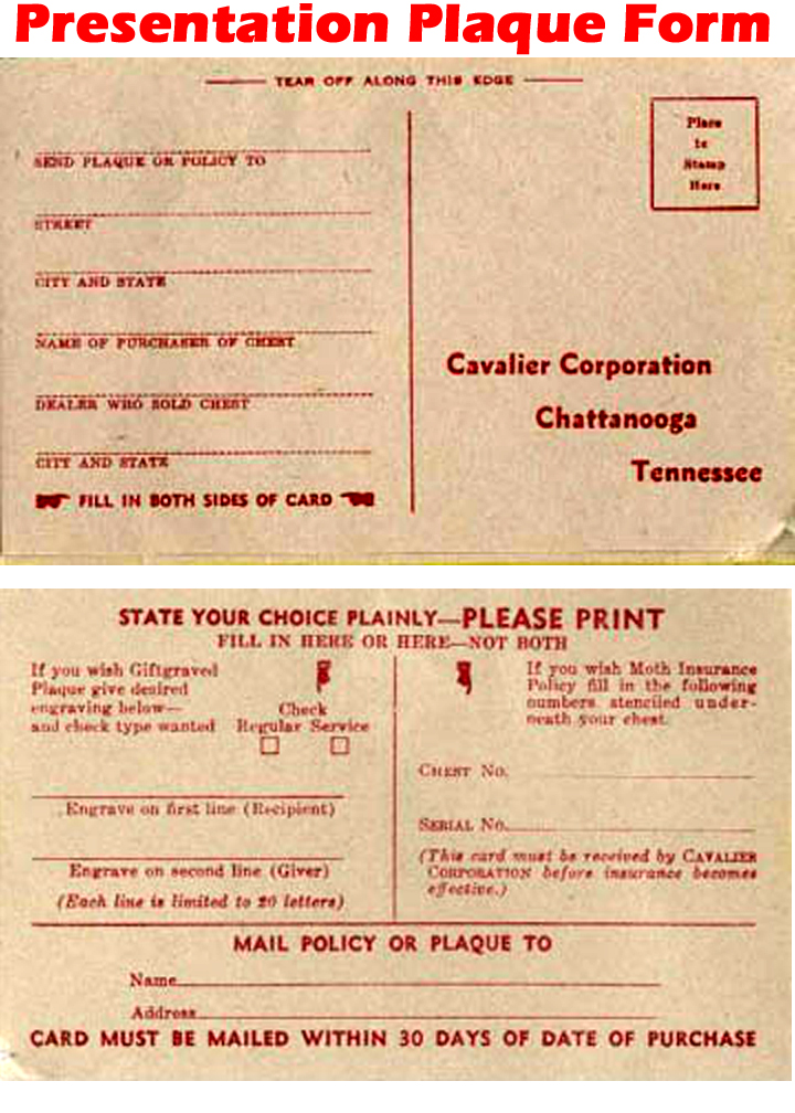 Cavalier Cedar Chest labels from the 1930s Note that the furniture store added its own label Click to Enlarge There was also a "Presentation Plaque" available. It slid into a little holder in the chest. It usually memorialized the gift of the Hope Chest to a daughter from Loving Parents. Add 10% to the value if you have the label and a suitably sentimental plaque. One of our readers kindly sent us a scan of the Cavalier brochure describing the chest and the plaque. Click here to download a ".pdf" of the brochure.