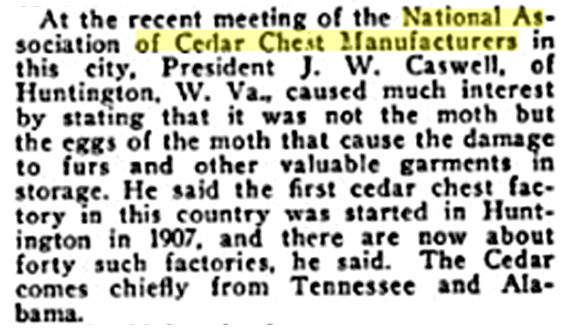 Yet another Variant Serial Number: Chest 6 Serial 1136 Click to Enlarge With all those corporate reorganizations, it is very likely that the company might have switched its method for assigning serial numbers --- several times. Since there are so many different variations, it is also entirely possible that the facrory (in Chattanooga) didn't put any numbers on the chest at all -- and that the numbers were added later by the retailer. The upshot is that we cannot give you any reliable way of decoding the serial number. Until a salesman's manual turns up, we'll all have to be content with this uncertainty. We got this from Sean, a reader from Ohio: Columbus, Ohio -After an intense bidding war, a 1930s cedar chest, which normally sells for approximately $300, brought the astounding winning bid of $23,000 during an estate auction in June. The estate belonged to Tillie E. Coleman, a local aficionado of antiques and collectibles who had attended auctions during much of her adult life. The auction, conducted by Mike Brandly, CAI of Columbus, drew over 400 bidders from four states. 1938 Magazine Ad for Cavalier Click to Enlarge The bidding war began when two 1930s cedar chest produced by Cavalier reached the auction block. After receiving an opening bid of $75, two bidders, both friends of Coleman, began competing for one of the chests, eventually driving the price to $23,000. Neither chest was "terribly uncommon," Brandly said. "They sell normally anywhere from $150 to $300." ![]() Join Us on Facebook Counter for the Entire Site, Not Just this Page | |||||||