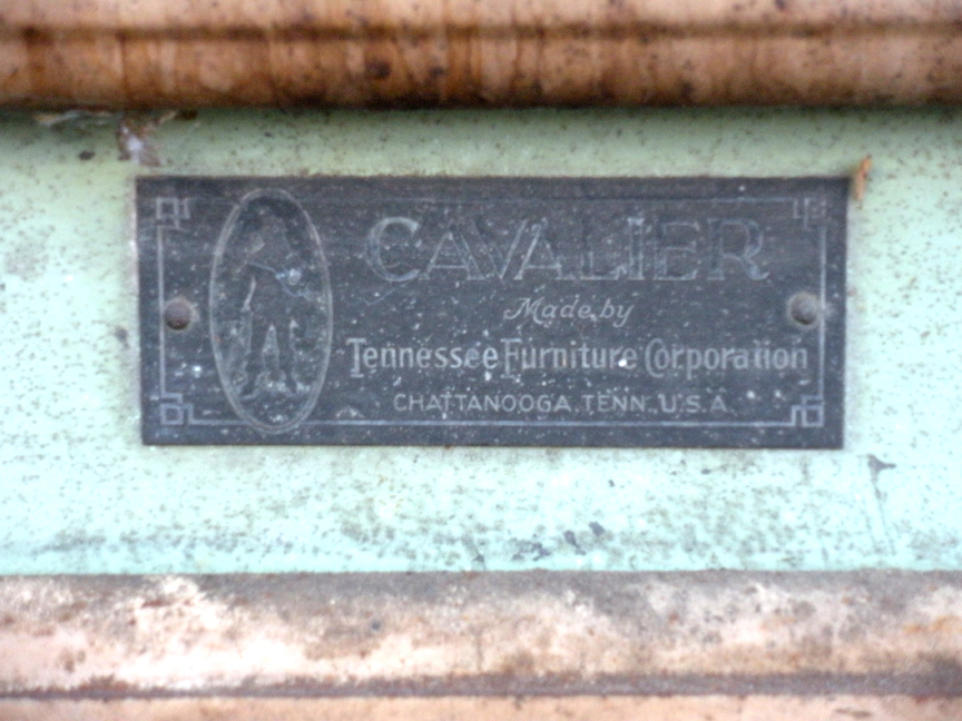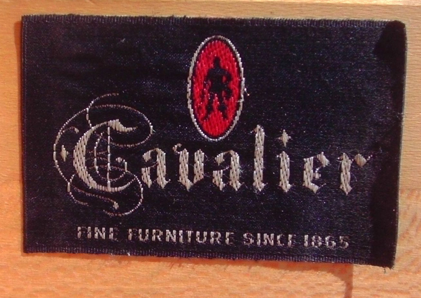 Varieties of Cavalier Identification Marks left two: paper label from the 1920s middle: Brass Medalion from the 1930s and 1940s right: Woodburned marker from the 1950s Click to Enlarge Our reader John found a piece of Cavalier furniture from the 1950s that had a cloth label, as shown below: