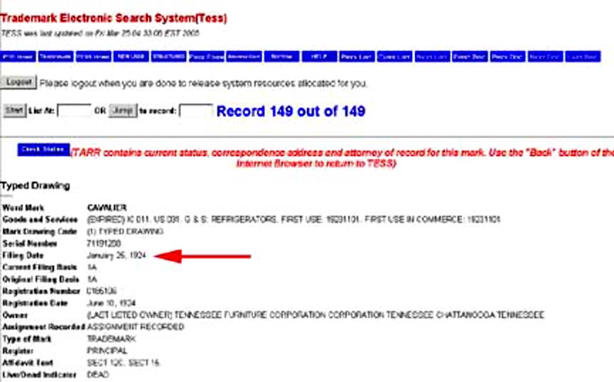The paint is sticking to the shellac, not the veneer. So, the idea is to dislodge the shellac from the veneer, taking the top layer of paint along with it. Shellac dissolves in alcohol but alcohol won't dissolve the glue that holds the veneer. So, to get the paint, target the shellac. NEVER NEVER NEVER use paint stripper -- it will dissolve the glue and loosen the veneer! If you are VERY patient, buy two gallons of denatured alcohol and a LOT of paper towels. Find a place on the paint that isn't very visible -- say, at the bottom -- and VERY carefully scrape away the paint with a razor blade, (like "shaving" it..) until you get a patch about 1/2 inch square. Then apply denatured alcohol as applied to a "pad" made of folded paper towel. This will dissolve the shellac in the immediate area of the little patch. You can use a plastic scraper to push back the paint that will crinkle up. Repeat lots of times and you'll have a clean piece (THIS IS A LOT OF WORK AND TAKES A LOT OF TIME). You will have to apply a tone stain to correct the veneer color, but the method will reveal any veneer effects, like bookmatching and contrasting colors. You may also find that you have some veneer repairs to do. With patience, you will have a very nice Cavalier chest. In MANY cases, you'll find that the lock has been permanently disabled. This is because the Young Bride became a Mom and found that her kids could easlily lock themselves inside the chest. If you have kids, consider this fair warning... If you want to restore or replace the lock, there is a very bright ray of hope: the locks were very simple and are still widely available and common furniture locks. If you need a key, any locksmith can make you one. If you need to learn the combination, any locksmith can find that out for you. In general, it is best to remove the lock (4 screws) and then bring it to the locksmith. If you ask him/her to come to your house, it will probably cost you $75. Even if you can't get the chest open, it is cheaper to bring the chest to the locksmith than vice versa. ![]() The company was founded in 1865 in Chattanooga, Tennessee and was ideally located due to the proximity of high quality hardwoods, skilled labor and rail connections and the very special Tennessee Red Cedar. The original name was The Tennessee Furniture Company, but the trademark Cavalier was first used in 1923; the trade mark application was made in 1924. Trademark Registration for the name "Cavalier" No Cavalier Chests before 1923 From the US Patent and Trademark Website Click to Enlarge The Company also made refrigerators (actually wooden iceboxes) and coolers. The name Cavalier seems to have been restricted to Cedar Chests and Iceboxes. Thanks to our reader, ,here are some photos of one of the Cavalier Brand Ice Boxes