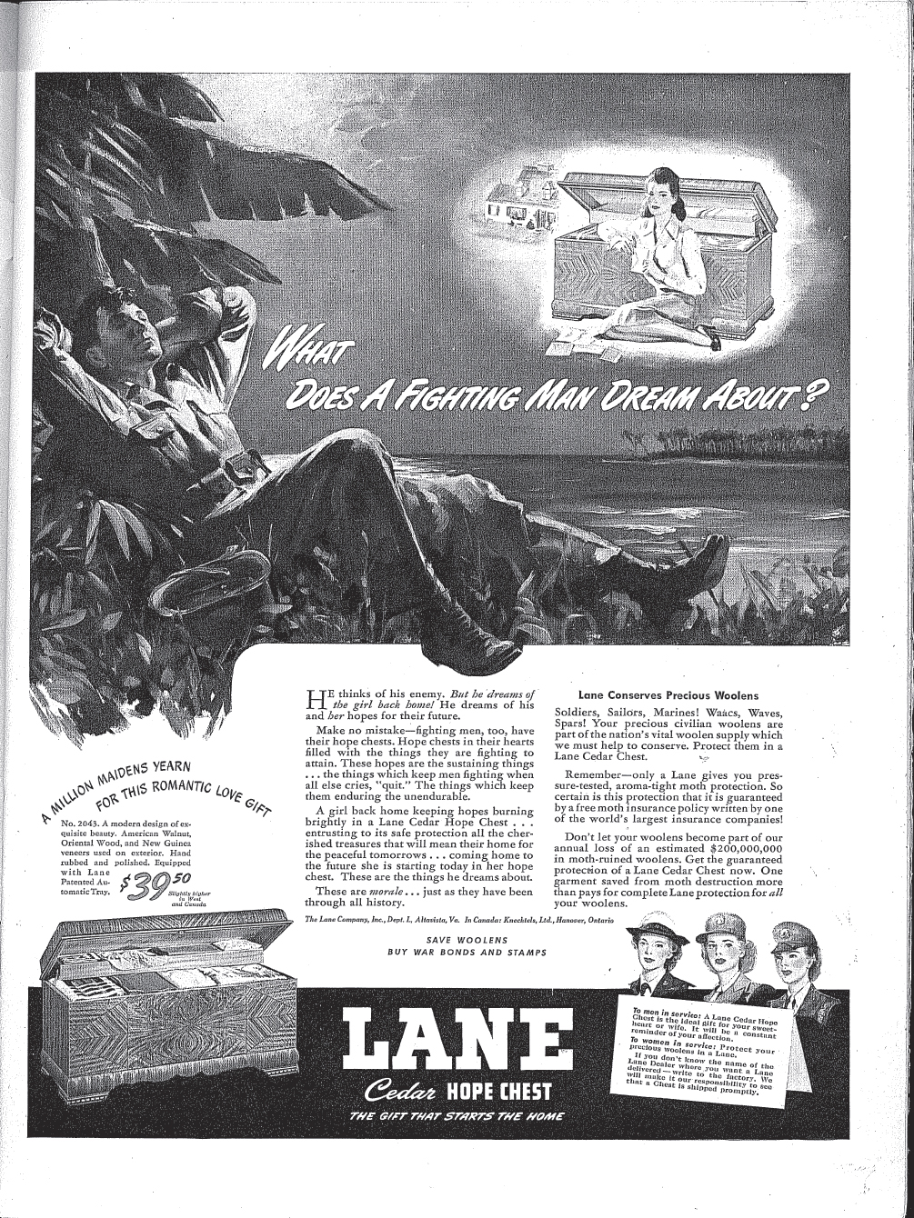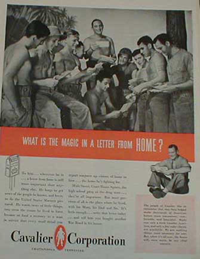 Ads From Cavalier and Their Competitors from 1941 and 1951 left three ads from 1941, right two from 1951 Click to Enlarge Here are ads published by Cavalier and Lane in 1943 and 1944 that have military themes. Of note, the Lane ad suggests that the Marines on Guadalcanal might have been dreaming about a cedar chest. Certainly a nice sentiment for the home front, but not very realistic...