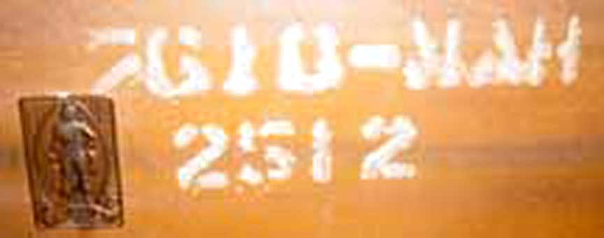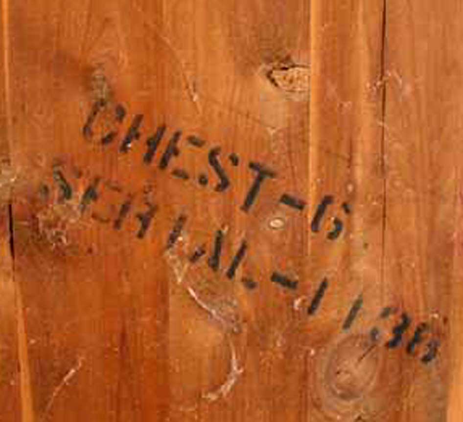 Example # 1 of Serial Numbers left: Serial Number right: chest bearing this serial number Click to Enlarge That said, the particular chest is most likely "Style 125", Walnut finish, made in 1932, either March 5 or (more likely) sometime in early October (35th week) THERE ARE APPARENTLY EXCEPTIONS! Waterfall (Moderne) and Traditional Cedar Chests Top: 48 WAL TENN. Bottom: Chest Pattern no. 711, and Serial no. 3994 Click to Enlarge Here are photos of two more Cavalier Chests, sent in by our friend, JoAnn. She writes: "... These two Cavalier Chests were given to me back in the early 50's. One of the chests still has the key and it works. Underneath the chest it says: 48 WAL TENN. I assume the 48 means 1948. The other one has written on it: Chest pattern no. 711, and Serial no. 3994. ..." Here is another form of Serial number, this time for a mahogany ("MAH") chest: Yet another Serial Number 7610 MAH 2512 Click to Enlarge Here is another Cavalier Chest -- this one with serial number "2747384" (not shown in the picture..), sent to us by reader John, who professses to be a "New Age Redneck."