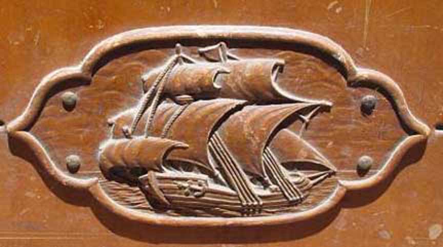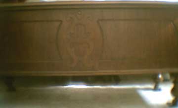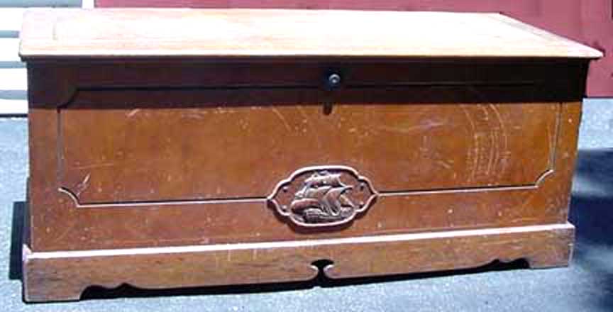 Lane Promotional Miniature Cedar Chest Click to Enlarge Above is a small promotional cedar chest from the Lane Company. On the inside of the chest, a carved message notes that the manufacturer was "Lane" but also gives the name of the furniture retailer. The lock actually works. The sticker indicates that the "real thing" has a lot more features than the sample. These small promotional items have become quite collectable and are used as jewelry boxes. Our lawyer reminds us that the monetary value of any object can only be determined in a fair auction with willing and knowledgeable buyers. We neither buy nor sell Cavalier chests and the information on this page is our best opinion given the facts. It is impossible to give a specific appraisal of any object without actually touching it. We do not give appraisals and do not represent ourselves as being qualified to do so. I have seen Waterfall Cavalier chests from the 1930s in good to excellent condition go for $500. Chests from the 1950s are worth a bit less. Here is an unusual 1930s chest with some minor damage in a not-so-attractive and definitely not authentic grey tone stain that was popular as "driftwood" in the 1950s. I questioned the owner and found out the original finish is very dark indicating that it may be a VERY Early Cavalier. (Be warned, however, that Cavalier offered a "Limed Oak" finish which has a grey appearance (like Driftwood) -- so don't rush to refinish your grey Cavalier chests.) If this was truly NOT the original "limed oak" , a nice refinish and repair job wpould greatly enhance the value of this particular chest. I wish that something was left of the records of the Cavalier Co. so that I could accurately assign a date to this piece and to help you separate refinished pieces from actual Limed Oak piceces. Possible 1930s Cavalier Cedar Chest Click to Enlarge In the early 1930s, furniture makers were very reluctant to move into the new Style Moderne or "Waterfall" genre, which was associated with cities, immigrants, and avant garde thinking. Much of the "Colonial" furniture in vogue at the time was Jacobean in origin; this style is more traditional, deriving from early New England pieces. No doubt that some of the Pilgrims packed their belongings in Jacobean chests that may have been cheap in Plymouth, being about 50 years old in 1620. In Colonial restorations like Sturbridge Village, they will note that the original chests didn't have legs and that when colonists prospered they added the legs so that you could dust under them. Sometimes, you can see applied decorations on the side that cover the holes where rope handles were attached to heft the things into the ships. Many individuals who craved social mobility (and, possibly to hide an immigrant heritage) sought to furnish their homes in things that looked like they may have come over on the Mayflower... Of all things, here is a maple Cavalier chest that actually has a carving of The Mayflower on it! This is the very "un-subtle" approach to creating an "heritage"...