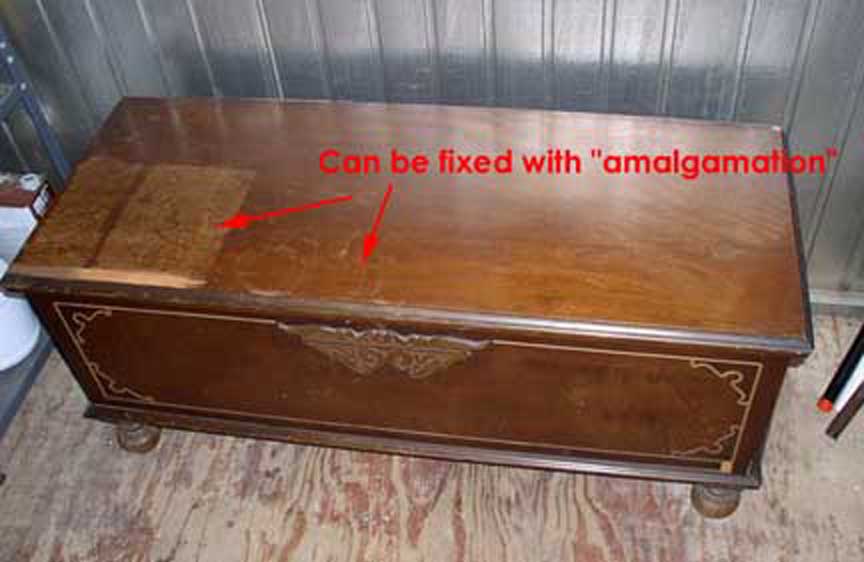 ![]() Good Candidates for Amalgamation Click to Enlarge Fear not -- the Cavalier Chest is so well built that almost anything can be fixed. In many cases, we can give you some helpful advice, but you'll have to send us a description of what's wrong with the veneer. Some pictures would be VERY helpful! Here are some common problems with veneer: