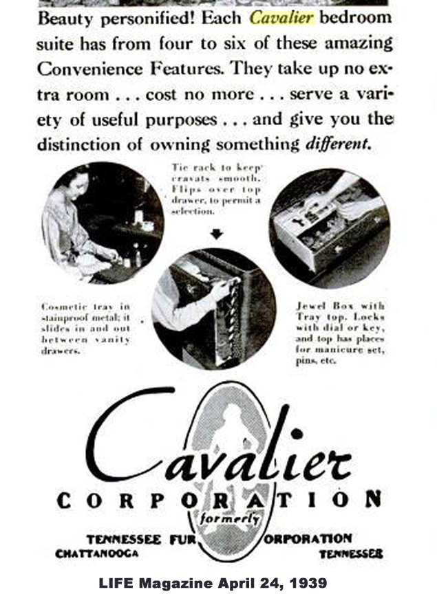 Cavalier End Table #5809 Ad from LIFE Magazine, November 20,1939 right: Ad from LIFE magazine April 24, 1939 Click to Enlarge Kim's end table comes from the "Natchez" re-creation series that reproduced the bedroom furniture of Mrs. Balfour Miller of Hope Farm. Readers who had a hankering for this style of furniture (to "bring back the Days of the Old South" could buy the Natchez set for "less than $100." Not only that, the furniture offered a variety of "convenience features" such as a tie rack, a jewel box or a cosmetics tray. Here is a vanity that was probably part of a bedroom set. It dates from the 1930s. This was sent in by our reader Kyle, who writes: "... I would like to share some pictures of my Cavalier vanity that I picked up at Salvation Army for $125. The Cavalier logo is in the top right drawer, and the back of the mirror still has a paper label on it (though I couldn't read the writing). It's also very petite - only 48 inches wide and 18 tall. I haven't been able to find very much like it online, so I thought I'd contribute pictures to the collection. ..."