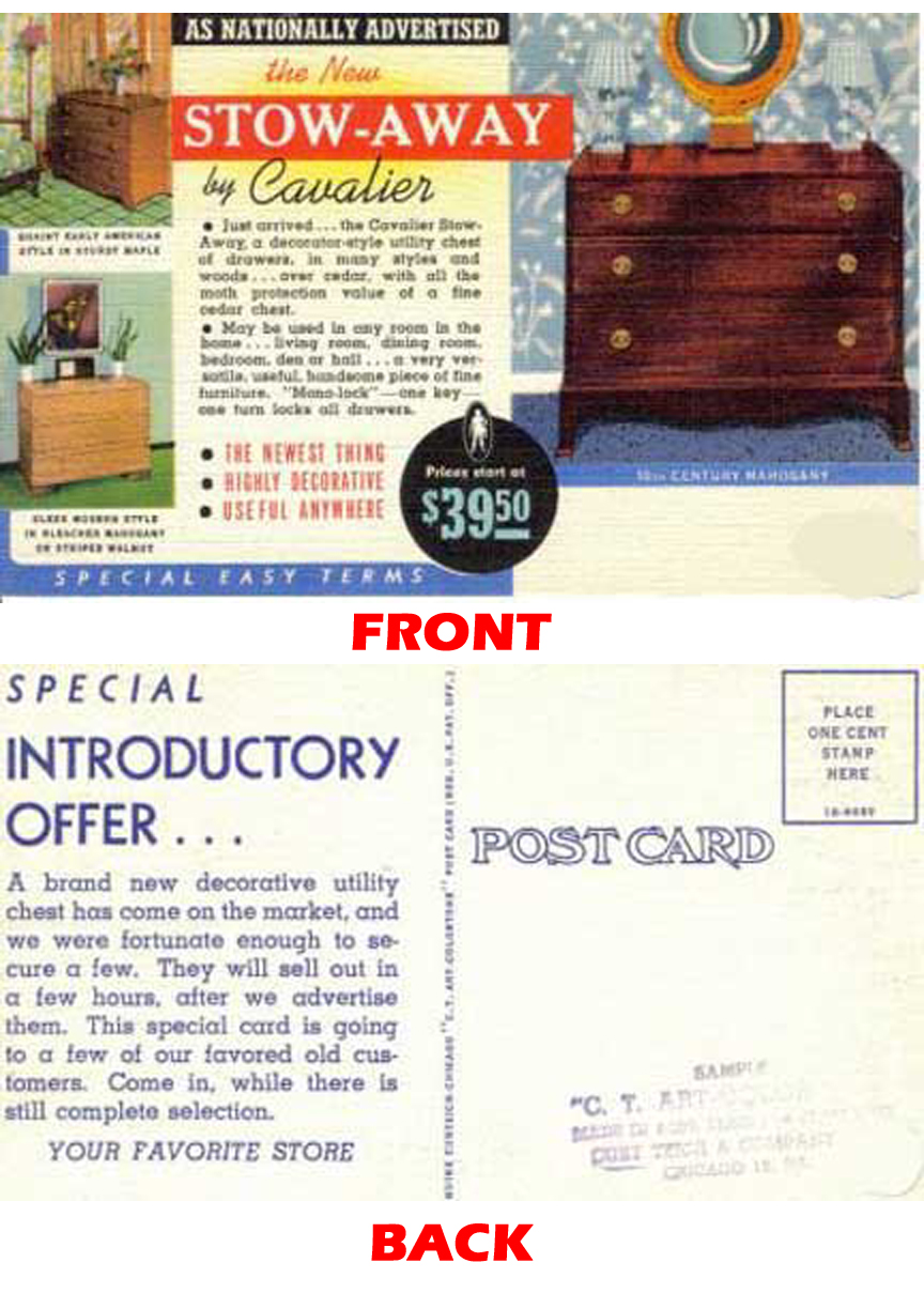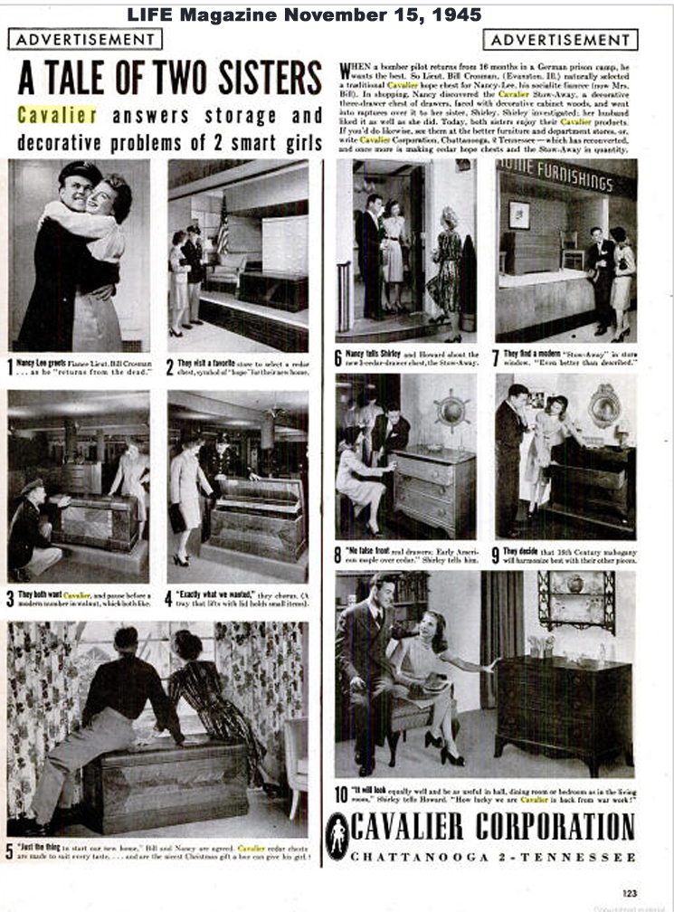 The Cavalier Stow-Away Chest Click to Enlarge Here are three ads for the Stowaway Chest. The one on the left was on a postcard; both front and back of the card are shown in the graphic below. The middle ad from 1942 (the darkest days of WWII) features a patriotic appeal to place the Cavalier chest in the "homes that [the GIs] are fighting for." The third (from 1945) is a full-page ad from LIFE Magazine, November 15, 1945 issue. It shows how the "Stow-Away" chest can meet the needs of space-conscious couples at the end of World War II. (There had been almost no new construction since 1929 and newlyweds were hard-pressed to find living space.)