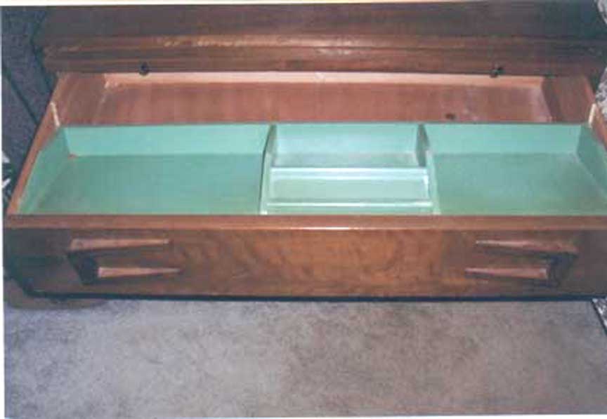Cavalier Stow-Away Chest Advertising left: promotional postcard middle: full-page ad from LIFE Magazine, November 23, 1942 right: full-page ad from LIFE Magazine, November 15, 1945 Click to Enlarge Here are some photos of a very nice Cavalier Stow-Away chest that shows Scandinavian design influence. The photos were sent in by our friend,Jess,who writes: "... This is a Cavalier Stow-Away that belonged to my mother-in-law. Thought you might like to see them. ..."