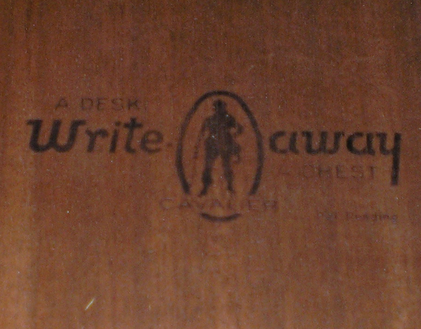 Jan's Stow-Away Cavalier Chest Click to Enlarge And, we have more serial number markings that are very different from the others... "... . ..." There was also a Cavalier "Write-Away" chest that doubled as a desk. From the photos, it appears that this is a "stow-Away" chest with a top that slides out to become a desk; this would have been very useful in a small apartment or a dorm room. Here is what we believe to be a very early version of the "Write-Away." It was sent to us by our reader Leslie. She writes: "... I'm seeking info on a Cavalier dresser I bought years ago at an antique shop. I can't find one like it online ANYWHERE! I guess it would be considered a "secretary" as has 2 bottom drawers (one is cedar) and a shallower drawer on top. The middle section folds down to create a desk space with cubbies. It has the metal Cavalier tag inside the top drawer. ..."