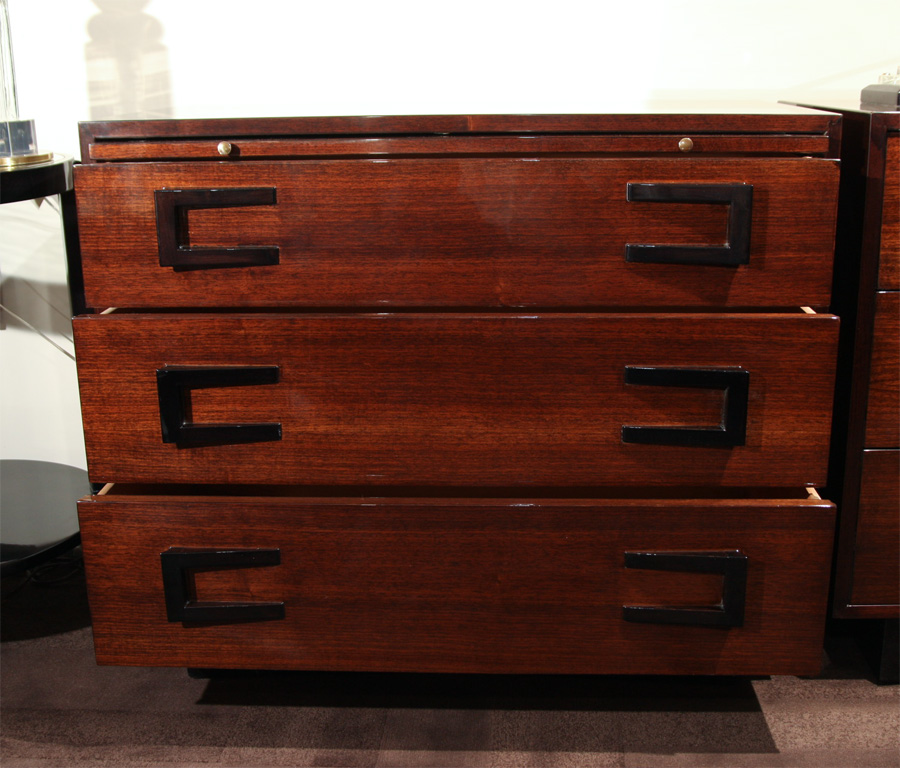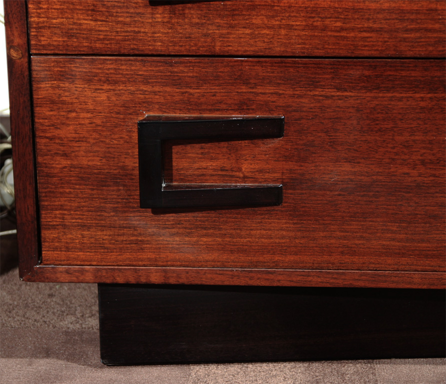 Linda's Write-Away Chest click to Enlarge Linda writes: ".. the "write-Away is American c. 1945 Modernist commode/desk in exotic mahogany with ebonized details and concaved ebonized bases.
