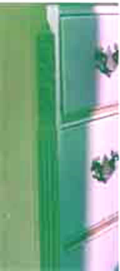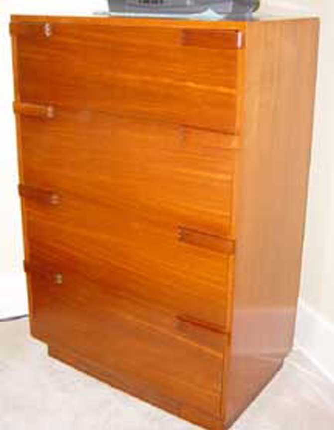 Each is fitted with three spacious drawers with stylized pulls, and some (but not all) feature a pull-out writing top. Current retail price for a fully restored pair [in excellent condition] could exceed $7900 [in 2009) Here is another Write-Away chest that is owned by our reader John who lives in Cahttanooga -- he says "... The lady that gave this desk to me has lived here all her life and probably bought it back in the the 40s or 50s. ...". We note that this one looks a lot like the Stow-Away with the addition of the writing desk. John thinks that the chest may have been painted and then stripped.