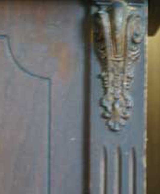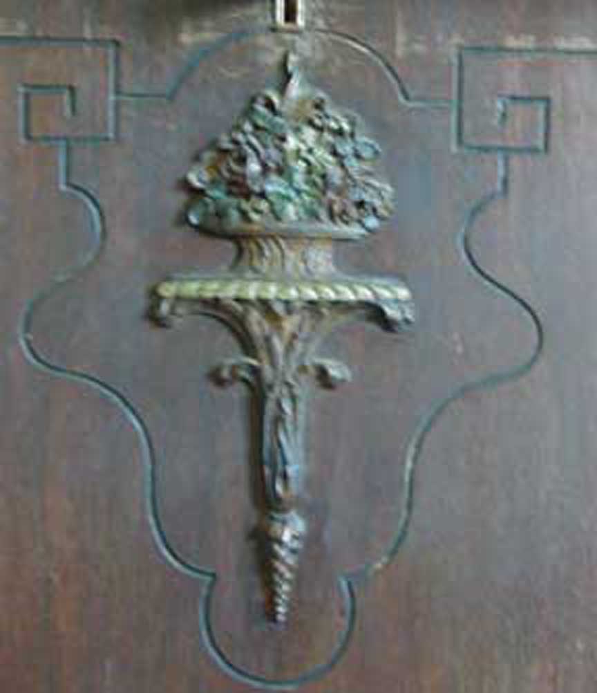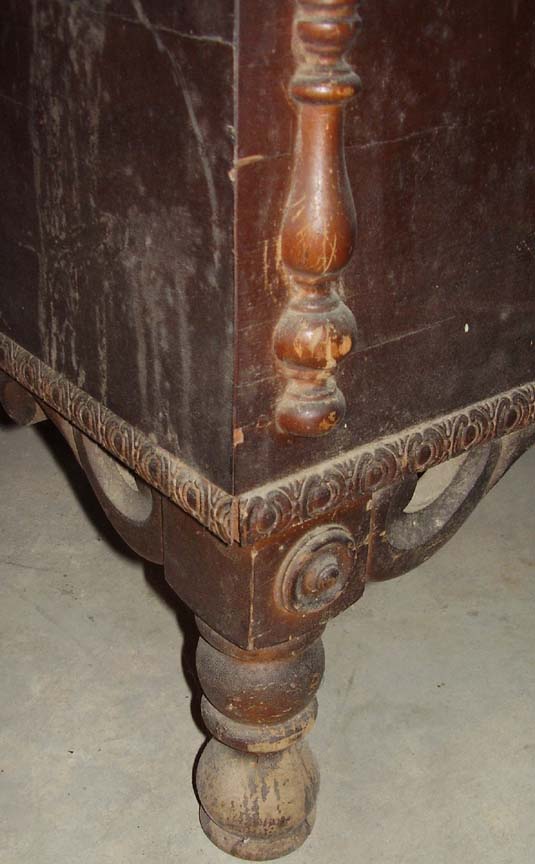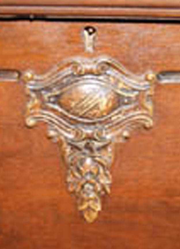 Similar detail found on unpainted chests It does have a Cavalie Badge Click to Enlarge Analysis: We here at Jitterbuzz are puzzled. Our guess would be that someone "customized" this chest, possibly in the 1940s or 1950s. I don't think that the Tennessee Furniture Company would have sold a chest with some sort of mistake -- they were perfectionists! On the other hand, I really LIKE the treatment shown here. This is a great way to bring the Jacobean style into harmony with Style Moderne. However, we don't want you to do anything irrepairable to your Cavalier Chest, either. Recently, Mike C. sent us these photos and wrote: ".... My mother in law recently gave this Cavalier Cedar Hope Chest to my wife. She originally got it from her mother. My wife would like me to try to "restore" it. I am thinking of stripping existing finish, restaining and varnishing. ..."