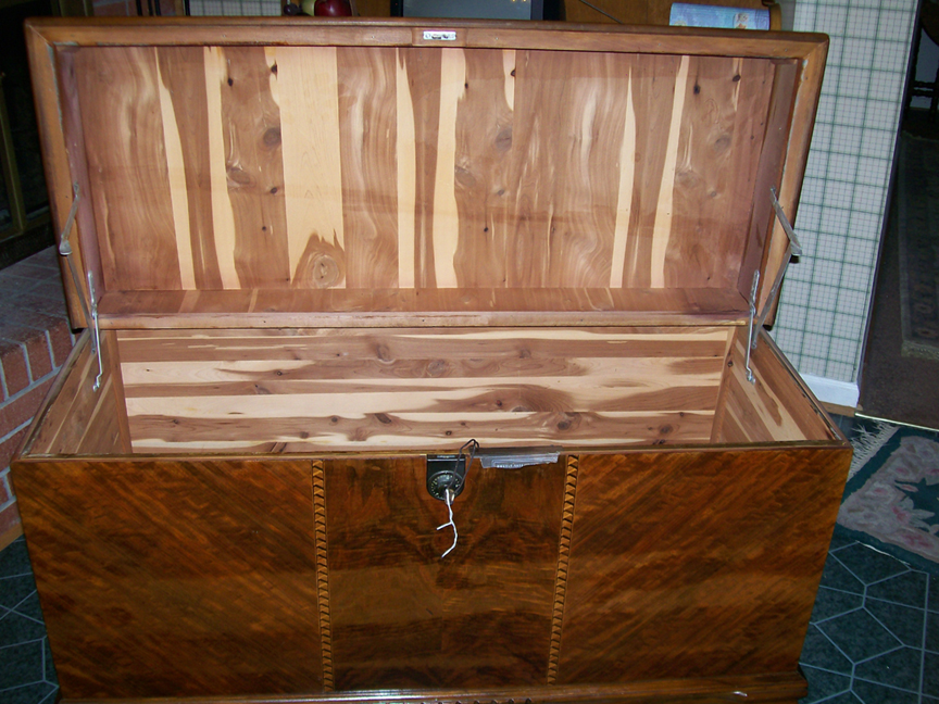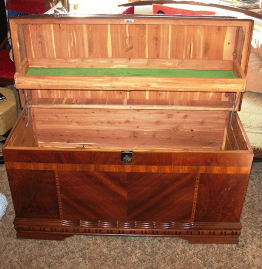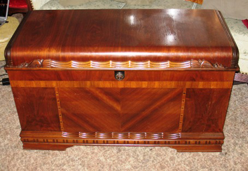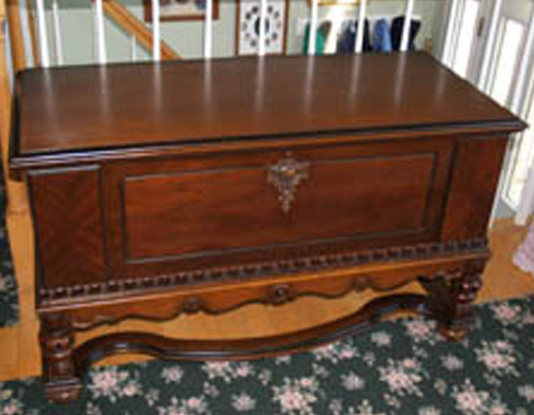 Jill's Cavalier Cedar Chest AFTER Restoration The Floral design is unique and very well done in the restoration Click to Enlarge It In February of 2011, our reader Brenda from Alabama sent us some photos of a traditional cedar chest. She writes: "... I wanted to share pictures of my grandmothers Cavalier Cedar Chest. ..."