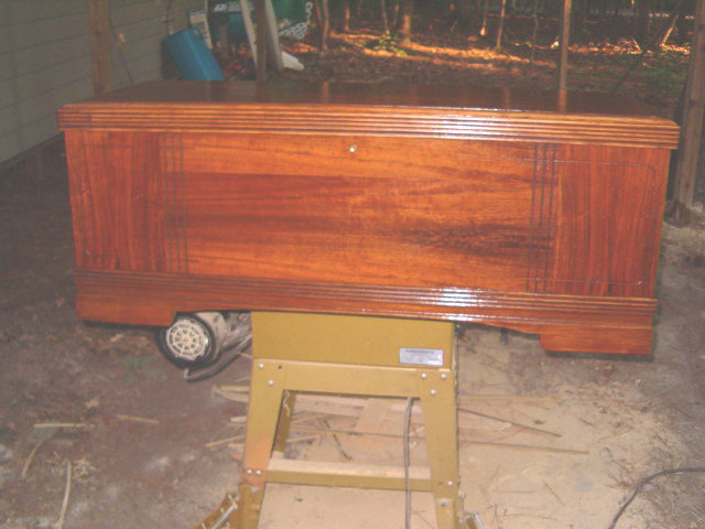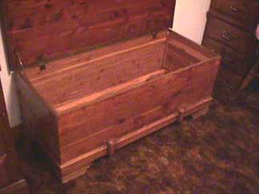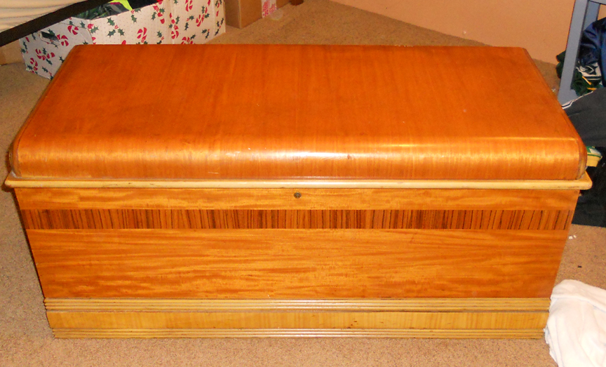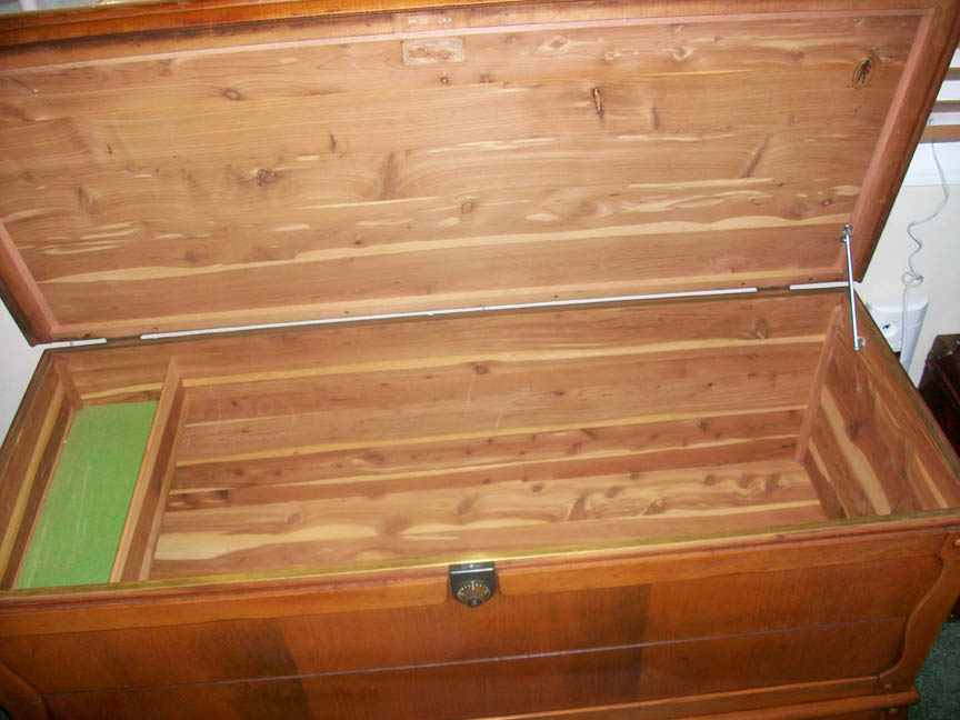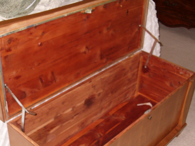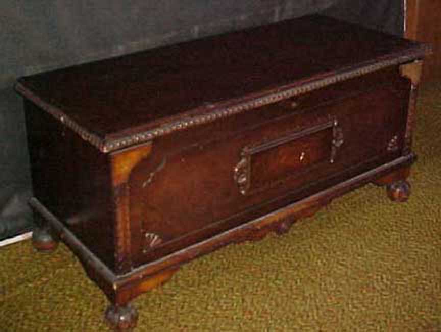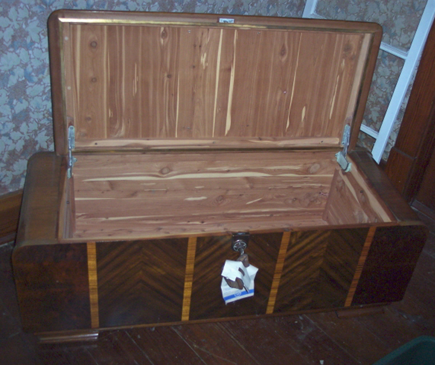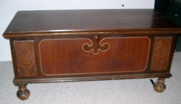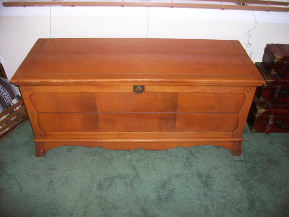 Mike's Cedar chestClick to Enlarge Our reader Deborah sent us these photos. She writes: "... My daughter wanted a cedar chest and we looked everywhere in Tidewater area, Virginia. Could not find one that was decent. Pressed wood very poorly made. We ordered one from a large furniture store in Williamsburg, Va. It came in damaged, they ordered it again. Came in damaged. I cancelled my order and proceeded to a used furniture store in Smithfield, Va. We lucked out and found this one. It cleaned up beautifully and it is a Cavalier. My daughter will be very pleased ..."