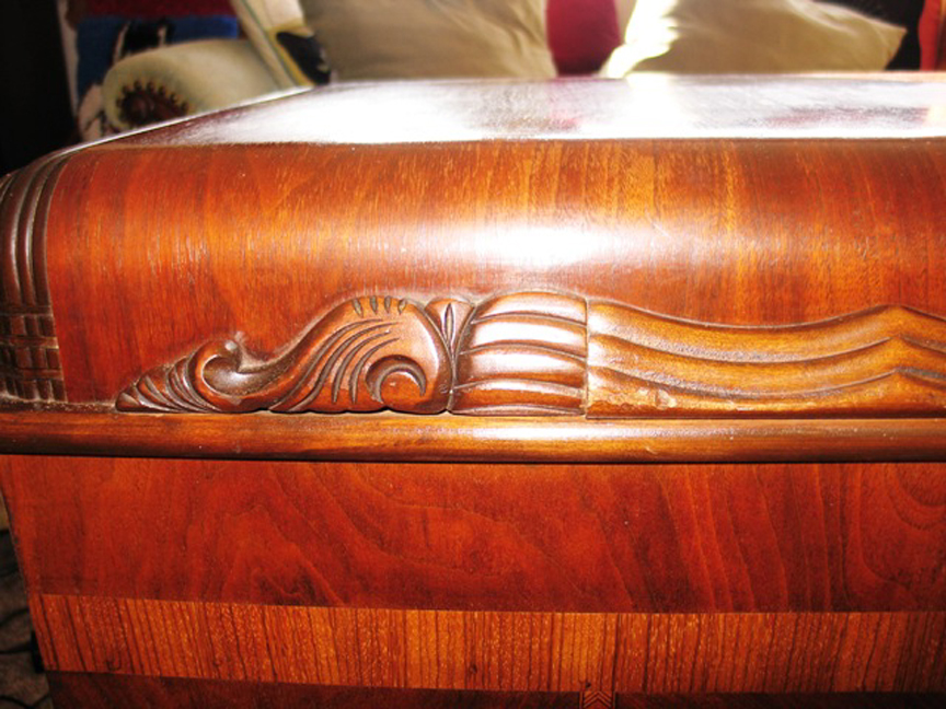 In addition to Cavalier furniture, we have a Calendar of Swing Dancing in DC, a Directory of Vintage Clothing Stores and a Guide to 1940s Collectibles. Thanks for tuning in! Feel free to Contact Me if you have questions or want to share photographs, hopes, and/or stories with the rest of the readers. Here are some photos of a very old chest that I believe to be from the period 1924-1928. Our friend Jenifer from Massachusetts wrote: "... The bottom has a stenciled mark 42-WAL. I have the chest hidden, since my 2 yr. old's eyes just LIT up when he saw it - he was quickly banished from the area!) ..."